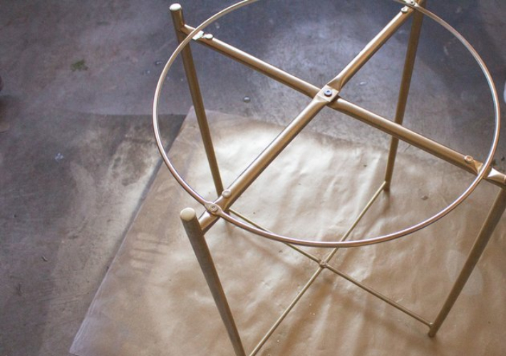 Ahora aplicamos la pintura dorada en spray a la estructura metálica. Quizás tendrás que dar dos manos de pintura.