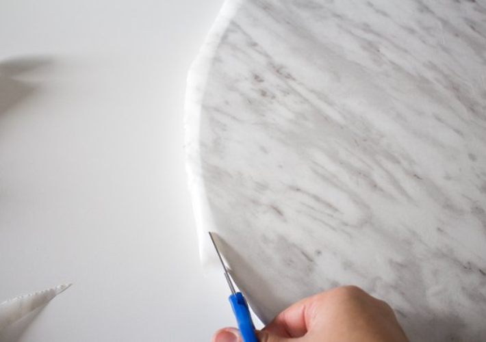 Toca el turno de forrar la tapa con el papel adhesivo de imitación a mármol. Al igual que hicimos con esta otra mesa de centro de IKEA. Eso sí por la parte de abajo.