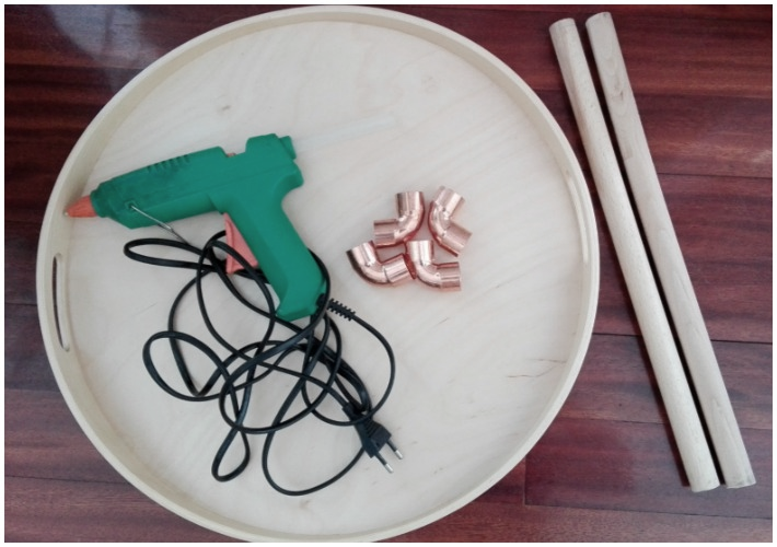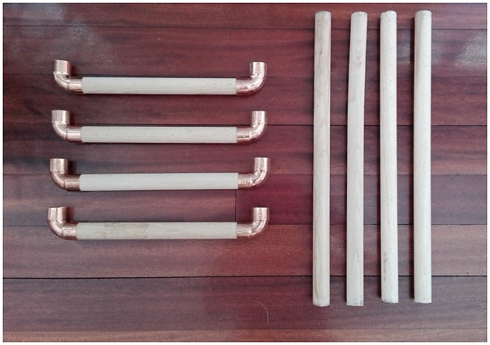 Colocamos los codos de cobre en cada extremo de los palos de madera de 23 cms. Es importante que te asegures que todos los codos están metidos por igual y que la medida total de los palos con los dos codos sea la misma en las 4 unidades. Si no es así la mesa quedará desnivelada y cojeará.
