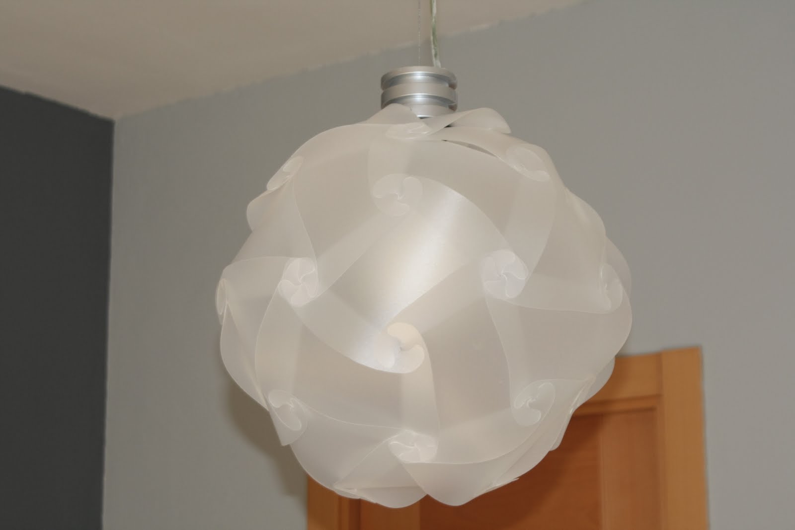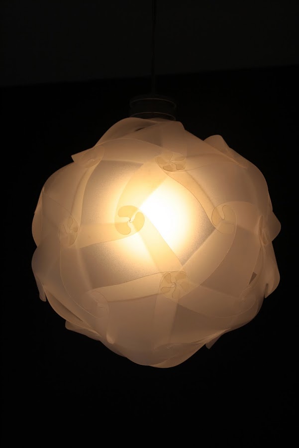 Nada más verla, decidí que tenía que intentar hacer una igual, ya que viendo el proceso de montaje, me pareció realmente sencilla para el resultado tan espectacular que proporcionaba. Y dicho y hecho. Ese mismo día hice una pequeña prueba en cartulina, y al ver que era tan sencillo como aparentaba, me puse manos a la obra y realicé la lámpara, esta vez utilizando como material cubiertas de encuadernar de PVC translúcido. Su montaje consiste en solapar 30 piezas exactamente iguales, que al irse uniendo van creando un triacontaedro rómbico.