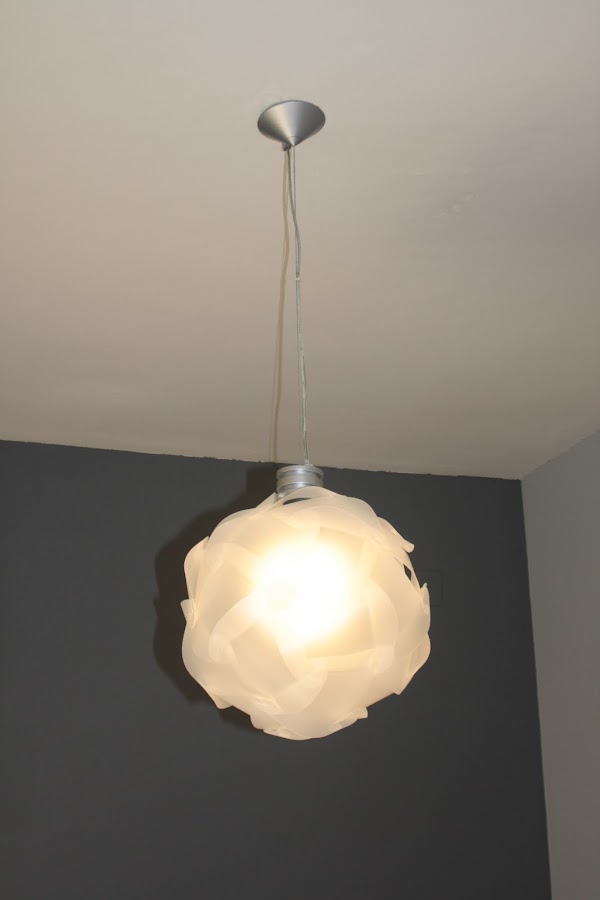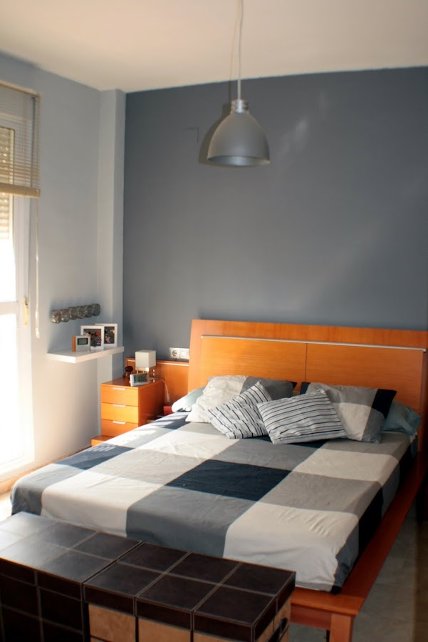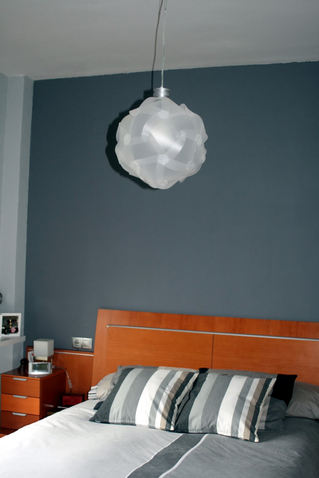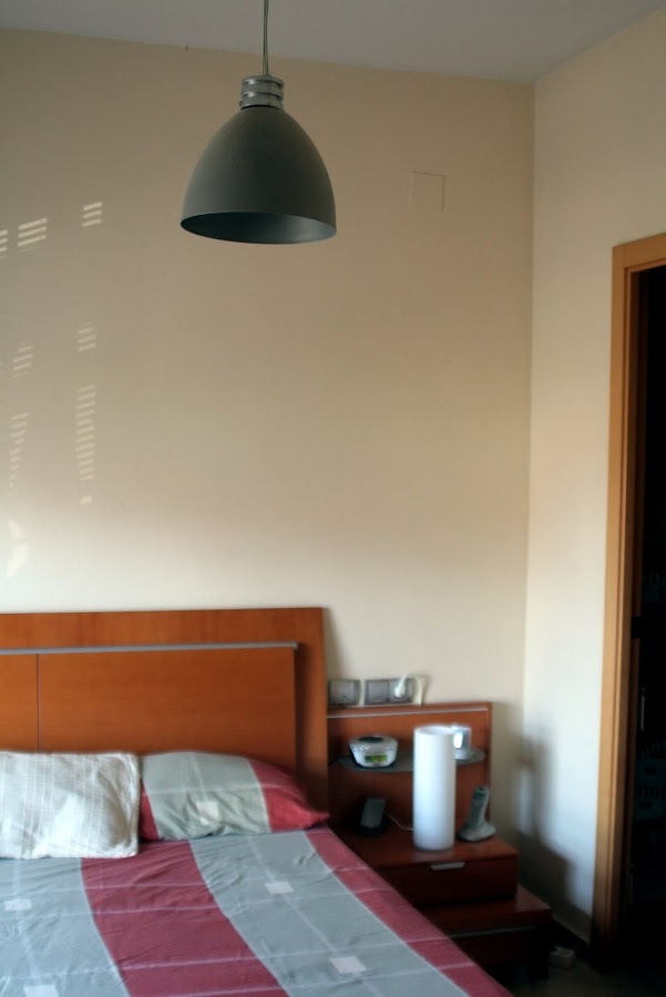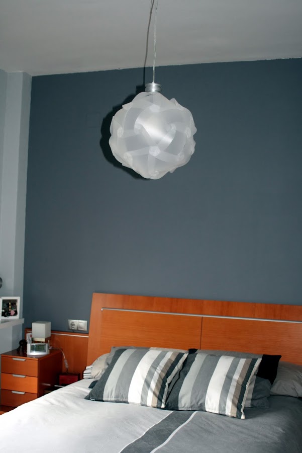 Aprovechando que el verano pasado nos decidimos a dar un cambio de aires al dormitorio y cambiamos el color de las paredes, encontramos la oportunidad y la excusa para hacer el cambio. Al pintar de nuevo el dormitorio, lo hicimos en dos tonos de gris, uno más oscuro para el cabecero y el resto de paredes en un tono más claro. El problema fue que al haber elegido estos colores, la lámpara quedaba camuflada y pasaba totalmente desapercibida.