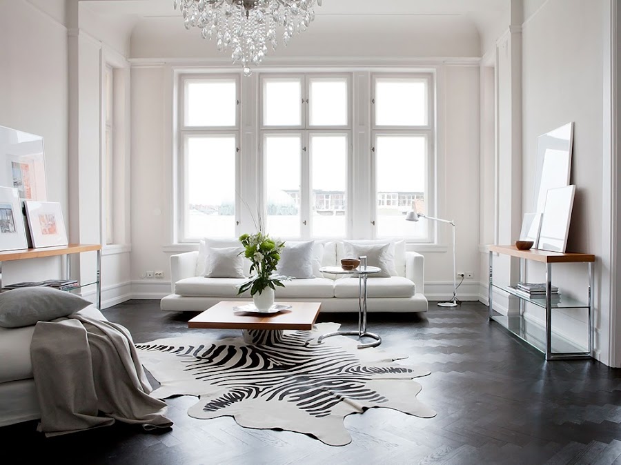 El salón que os traigo hoy, me tiene enamorada por su impecable decoración en tonos blancos. Un conjunto creado por un maravilloso y ligero mobiliario tapizado en tonos blancos, piezas en acero y cristal, y pequeños toques de madera, que contrasta con el suelo en color pizarra, al que solo se cubre con un par de piezas de piel perfectamente integradas.