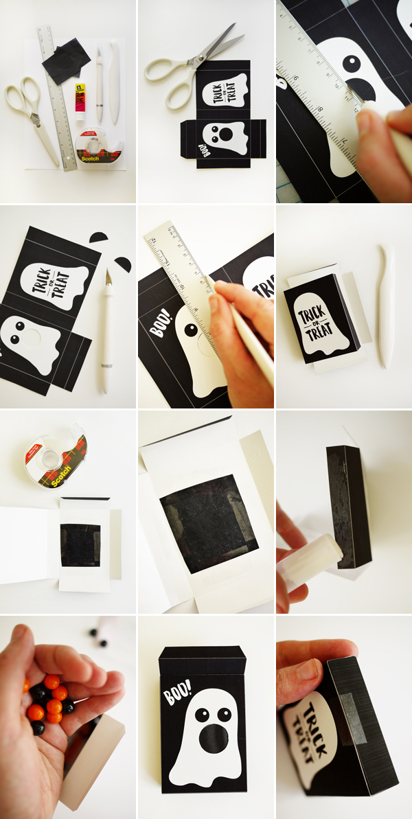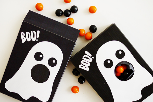 La primera es una caja en blanco y negro con el dibujo de un fantasma. La puedes dejar tal cual viene, o como puedes ver en las fotos de abajo, recortar el trozo de la nariz poner un trozo de papel de seda dentro (así será más fácil romperlo) y que tengan que coger las chuches por ahí.