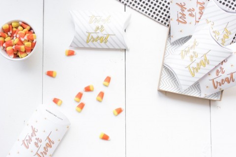 La segunda es una caja petaca blanca con líneas en gris, con el texto trick o treat (truco o trato en inglés).