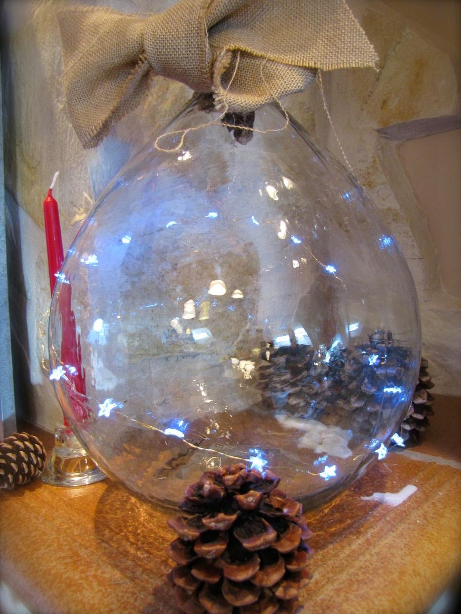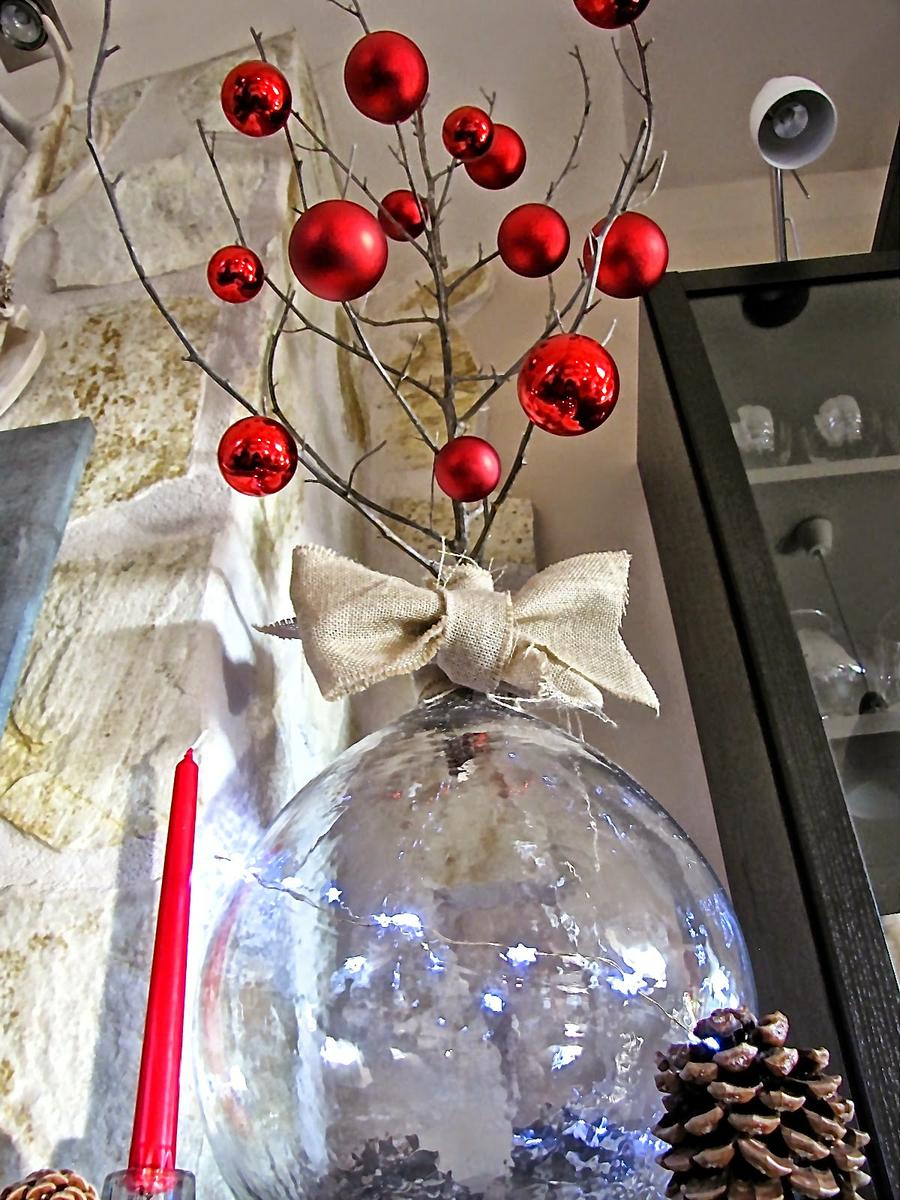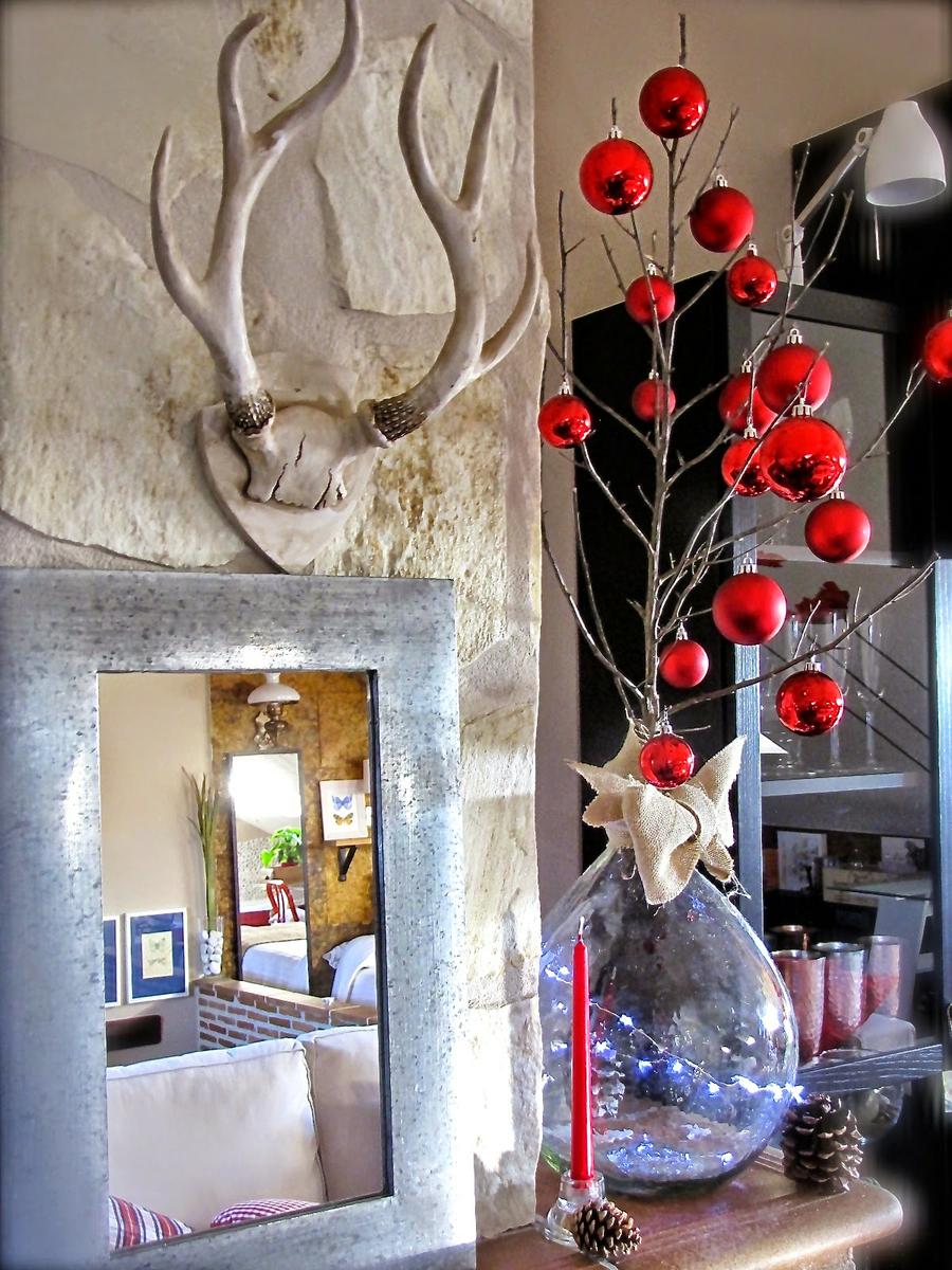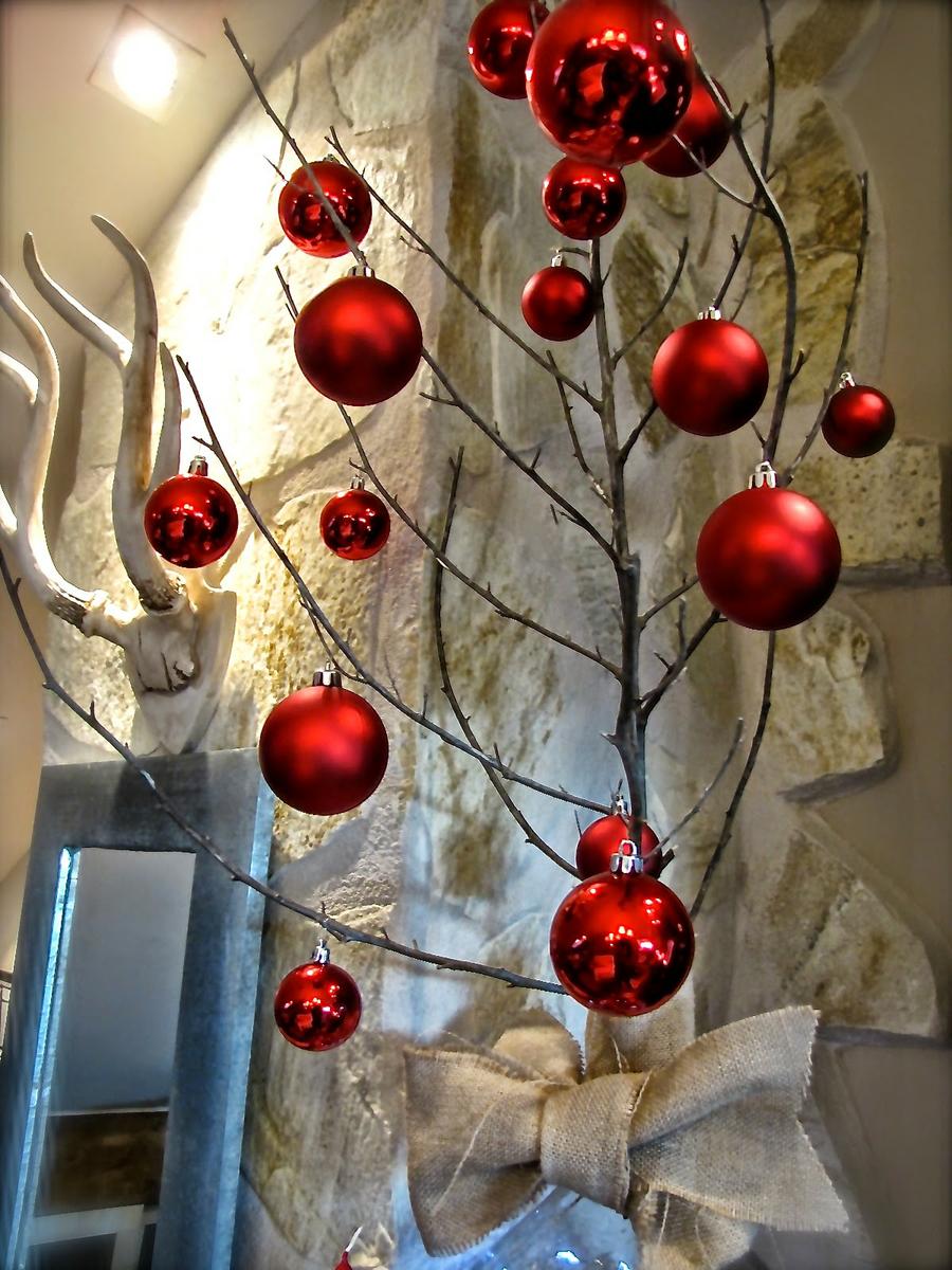 En esta ocasión... Hemos prescindido del tradicional árbol y hemos usado una simple rama, algunas bolas del mismo color y como soporte una damajuana...