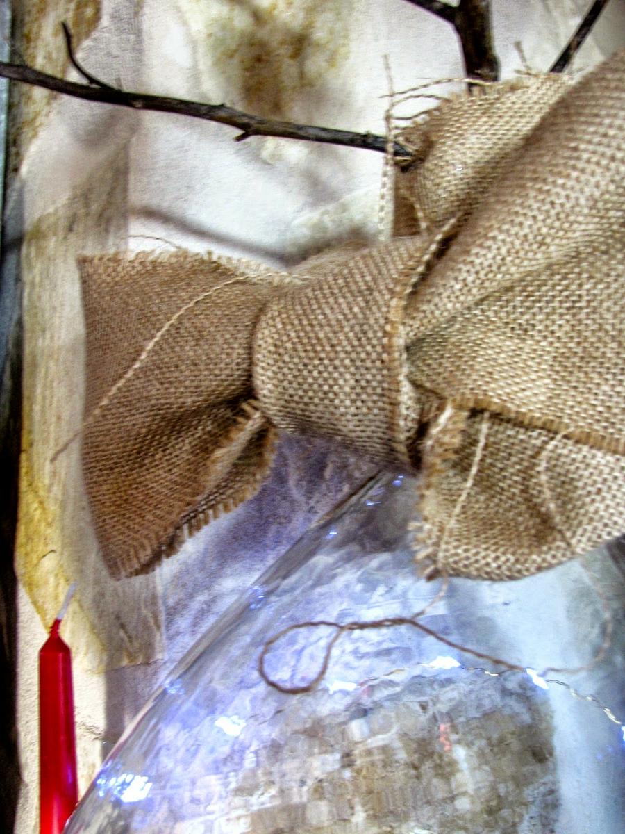 Además hemos forrado la boca del recipiente con tela de saco, rematada en un enorme lazo y optado por unas sencillas luces en tonalidad azul muy cálida...