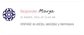 Marga Almenara Serrano se lleva el premio y también mi agradecimiento por su participación además de contribuir con su definición de VINTAGE a mi pequeño experimento. Habéis sido muchos -la mayoría- los que la habéis incluido en el formulario de contacto y no en el post… Supongo que no me supe explicar bien, pero me parecía un ejercicio interesante que todos compartiésemos nuestra visión de lo que es vintage, ya que es un concepto difícil de definir. De hecho, no hay ninguna respuesta igual! Muchas gracias a todos los participantes y espero que haya suerte en otra ocasión. Feliz semana!