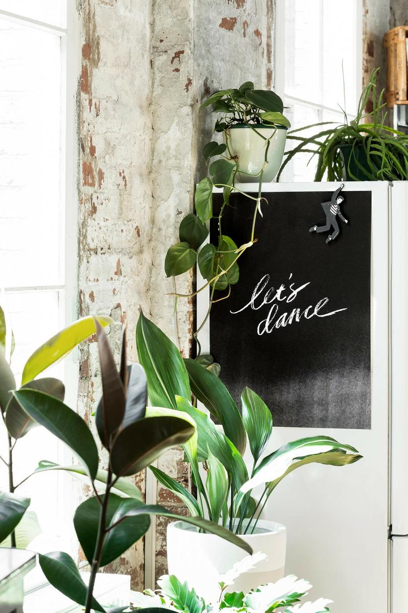 Me encantan las paredes de ladrillo visto de aspecto envejecido, sin duda le dan un toque super especial a toda la vivienda, junto con las obras de arte, elementos oscuros como las mantelerías, toda la cocina de aluminio y el fantástico suelo de madera… el fregadero y lamparas antiguas, mucha vegetación y barra en la cocina hacia un gran espacio abierto que sin lugar a dudas te invita a disfrutar de él.