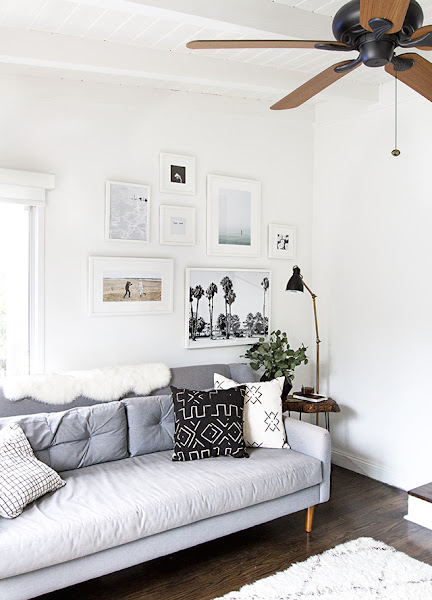 Seguro que más de una vez os habéis planteado poner una bonita composicoón de fotos en casa porque es un recurso muy socorrido, y muy asequible, para darle estilo a una estancia. Y además es una de las maneras más personales de decorar una pared de nuestro hogar dándoleun toque nuestro, único e irrepetible. ¡Decoración a la carta! Y lo mejor de esta decoración es que sólo tienes que cambiar alguna foto o lámina para darle una nueva imagen. Una buena idea es hacer la composición con marcos de diferntes colores y tamaños. Aquí los vemos todos en blanco pero con diversos formatos. Hay diferentes formas para componer nuestra pared de fotos: hay quien prefiere hacerla primero en el suelo, hacer una foto y pasarla luego a la pared para ver cómo queda, otros sin embargo usan papeles de periódicos con las medidas de los marcos para hacerse la idea de cómo encajarlos, o como vemos aquí, utilizando washi tape para preparar la composición. Sea como sea os animamos a hacerlas porque quedan genial.