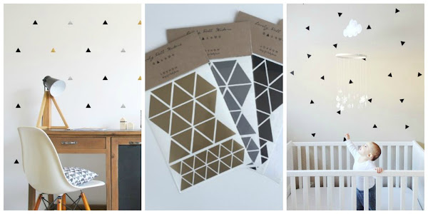 Os lo decía el lunes, soy una loca de los papeles pintados, pero he de reconocer que los vinilos adhesivos son una solución perfecta para personalizar una pared - o simplemente un objeto - totalmente a tu gusto. Son fáciles de colocar y, aunque si quieres hacerlo con una composición en línea tendremos que marcar unas guías, también pueden colocarse de forma aleatoria, o muy separados, o muy juntos... todo dependerá del efecto que busquemos y de nuestra imaginación.