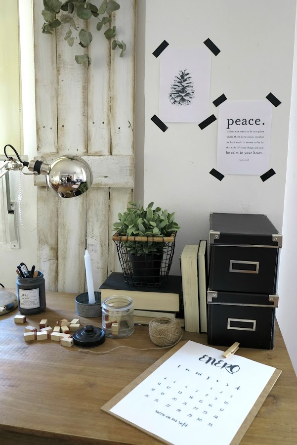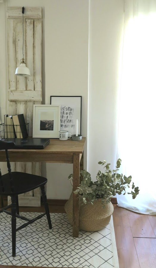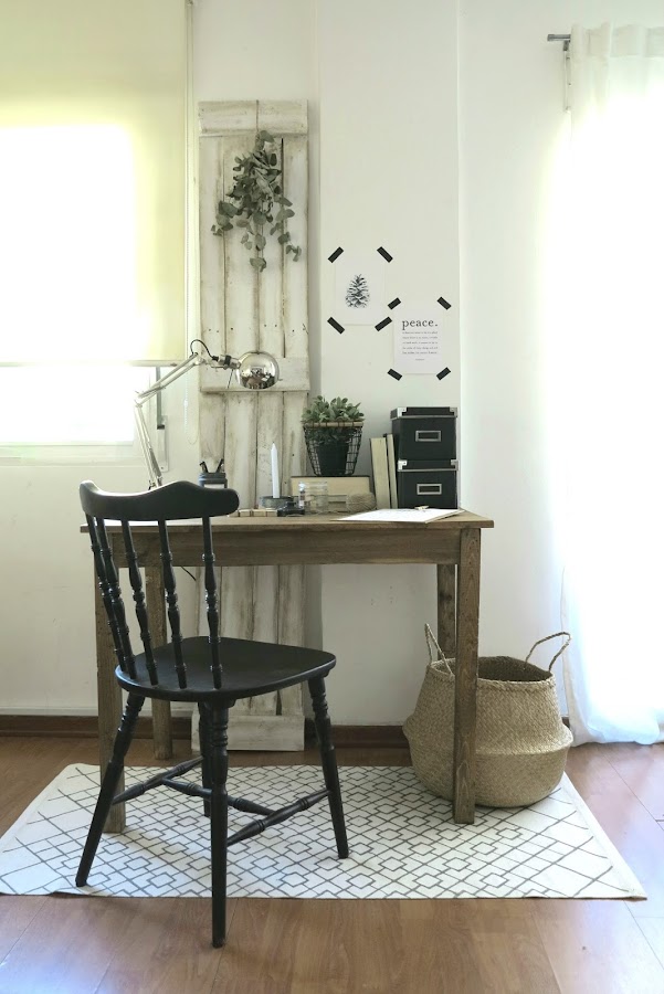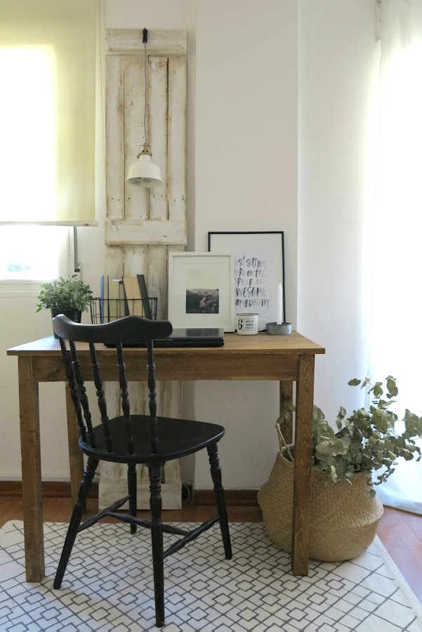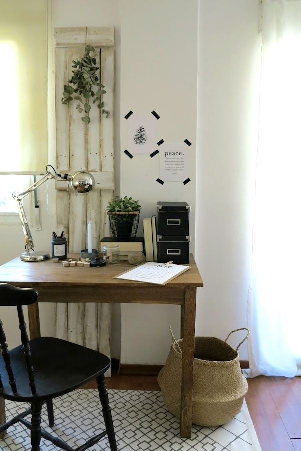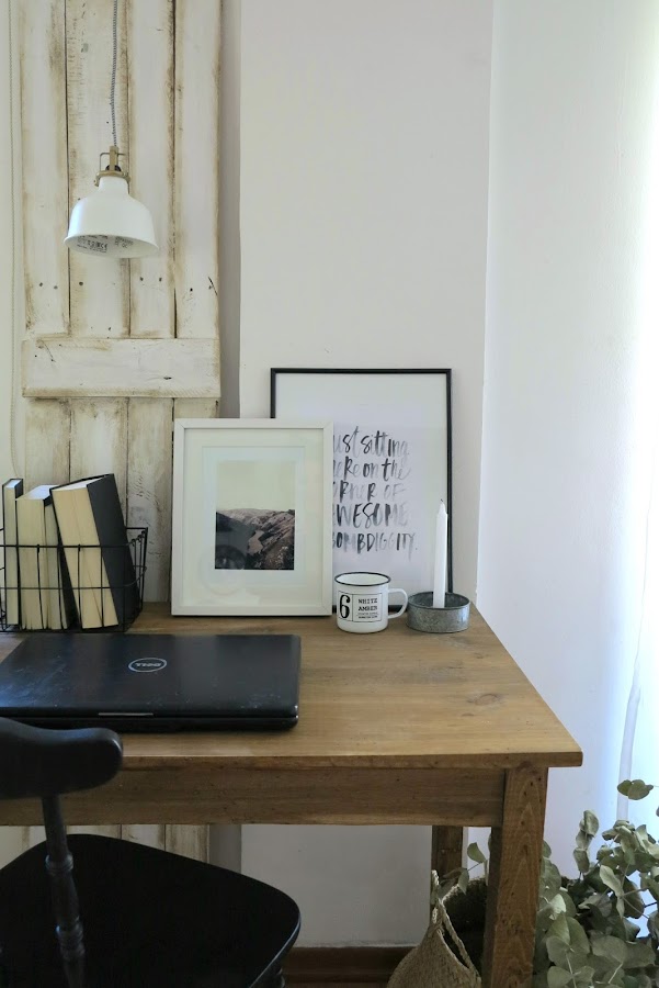 En el post de hoy os he creado dos rinconcitos en mi mesa de estudio con dos opciones a las que le daría uso a esa puerta, como es la de colgar un ramo de flores secas, en este caso eucalipto, que me fascina como queda en la decoración. O colgar una lámpara para darle un punto diferente, y no usar una lámpara que pueda estar en muchas casas, como el típico flexo de estudio.