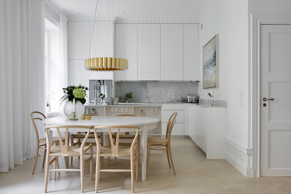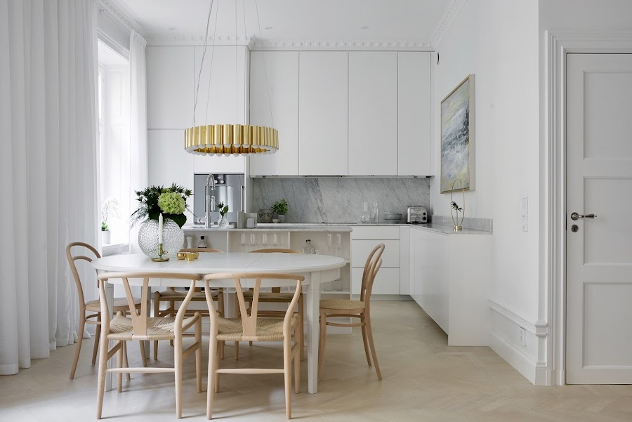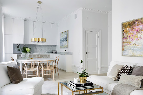 3. El mobiliario blanco contrasta con las sillas en madera del comedor, la lámpara y los marcos dorados de espejos y cuadros. Combinan a la perfección blancos con tonos metálicos, otra idea interesante para mi propia casa.