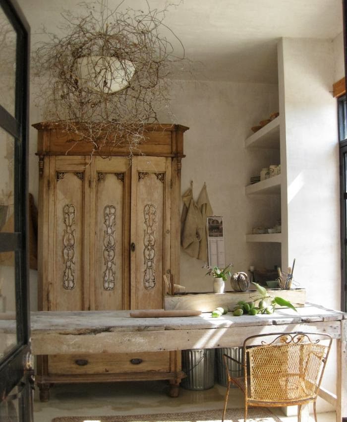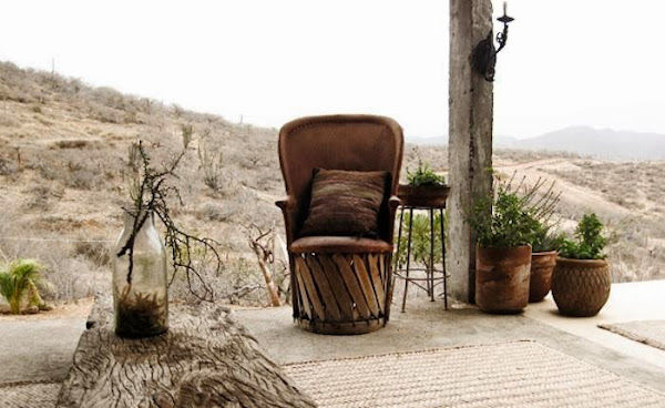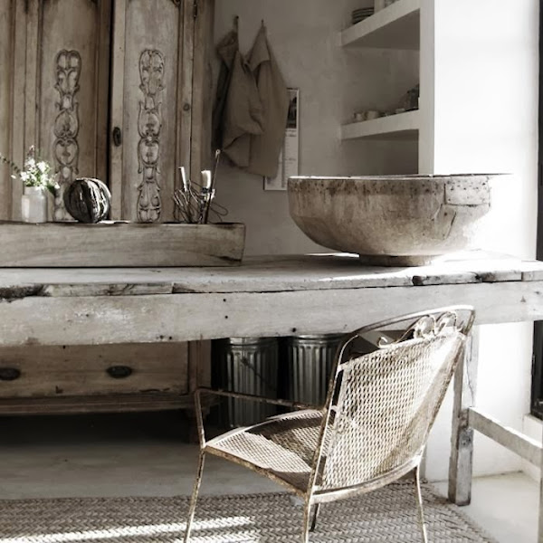 Me he quedado atrapada por la luz, la madera antigua, los materiales naturales, la sencillez y la calidez de estos espacios. Vienen desde México y pertenecen a la casa de la pintora Patricia Larsen. Construida con bloques de cemento y yeso, en una paleta de colores neutros, y con un estudio donde pintar, la verdad es que puedo imaginarme a la artista en plena faena plasmando su inspiración en un cuadro.