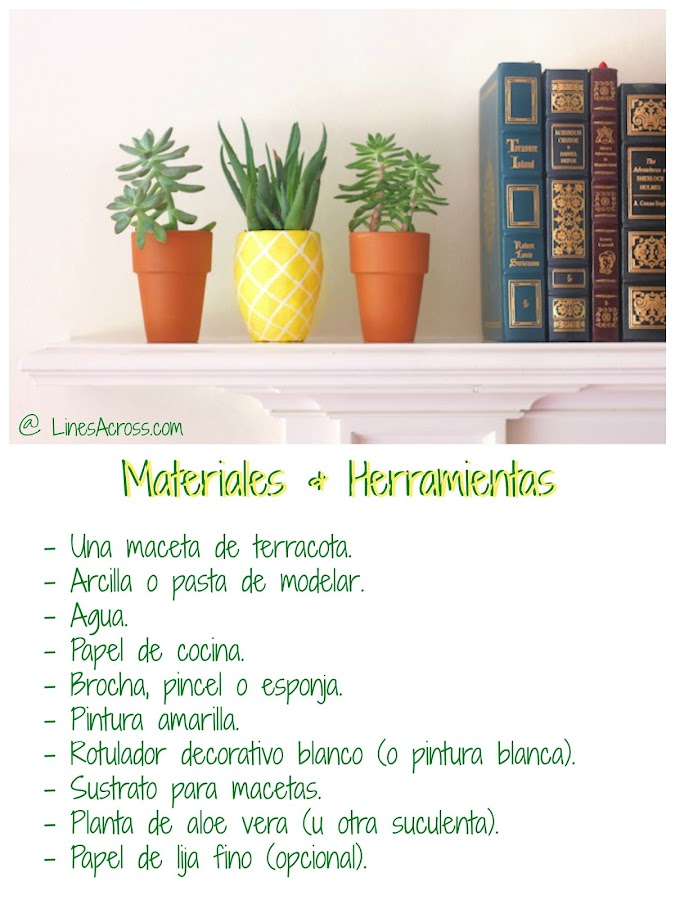 En el tutorial original Rachel, su autora y bloguera de "Lines Across", dice una frase que creo que resume la idea de este macetero-piña DIY: "cada vez que la miro, me hace sonreír". Así que... ¿os parece si intentamos conseguir esa sonrisa nosotr@s también?