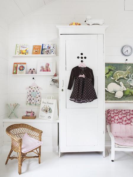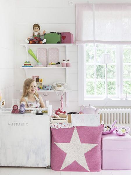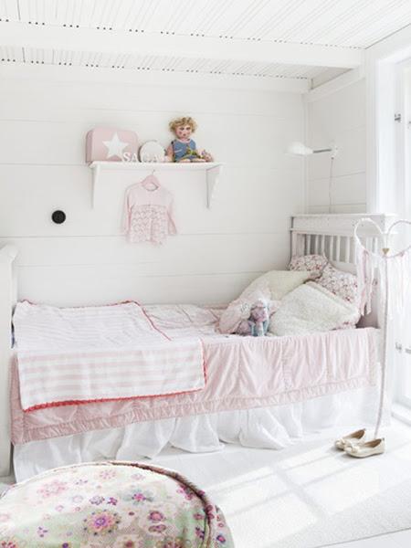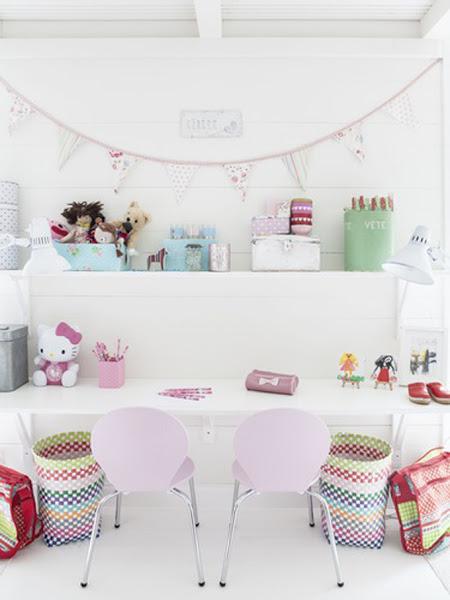 Que preciosidad de dormitorio el que visitamos hoy. Seguramente cualquier niña soñaría con una habitación como esta. Con una zona de juego en el altillo, un precioso escritorio compartido.... llena de detalles super inspiradores y con una gama cromática luminosa y delicada.