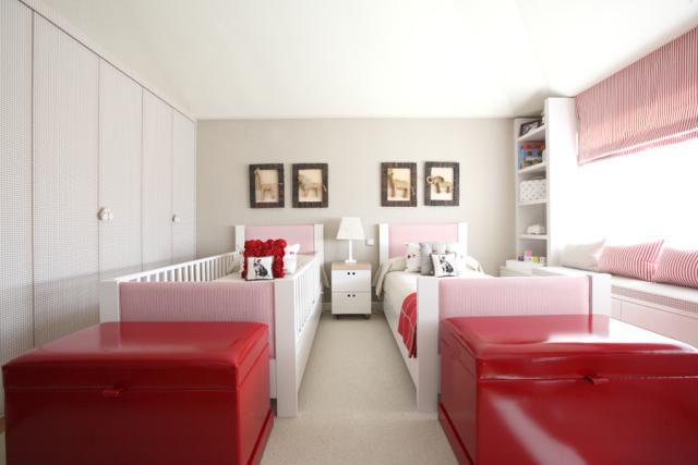 Este dormitorio infantil rompe moldes por tener un diseño impecable, visualmente ordenado y con un juego de colores impactante. Mónica nos muestra en su blog Aires de decoración como la mezcla de un color tan potente como el rojo con el delicado rosa conforman un espacio ideal para dos hermanos, un niño y una niña. Un espacio unisex cuidado hasta el último detalle, que firma el estudio de Bárbara Chapartegui.