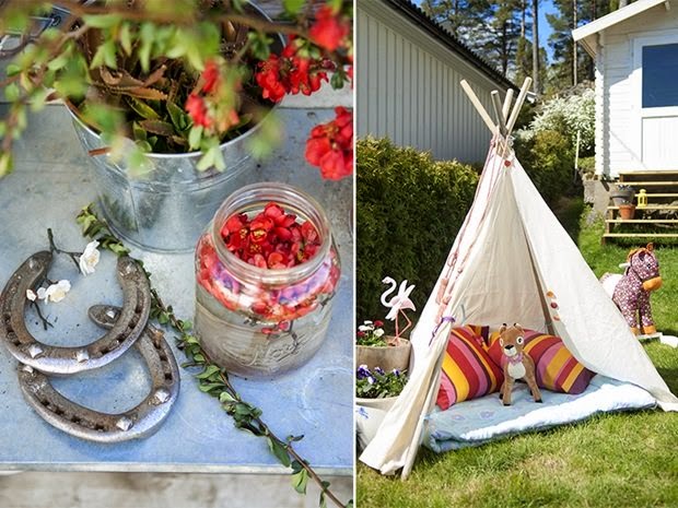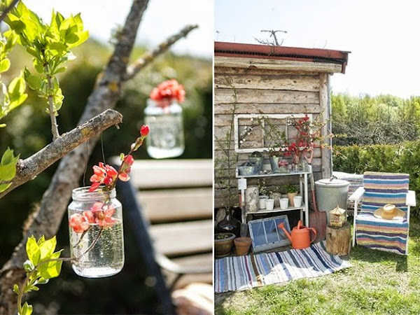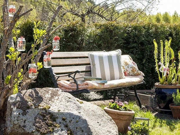 Una combinación perfecta para el verano, exteriores y reciclado! Las terrazas, jardines y porches ofrecen una infinidad de posibilidades para decorar reciclando y utilizar materiales que nos ofrece la naturaleza. En esta ocasión este jardín esta decorado con palets, troncos de madera, tarros de cristal usados y antiguos bancos de forja, ofreciendo un ambiente único para disfrutar de una soleada tarde de verano.