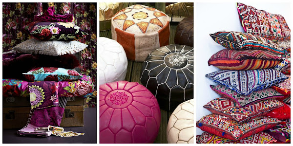 - Cojines y pufs. Otro de los impresdindibles boho. Sobre sofás, sillones, columpios o directamente sobre las alfombras o el suelo, invitan a todo el mundo a sentarse y disfrutar de la conversación y el relax que transmite este tipo de decoración.