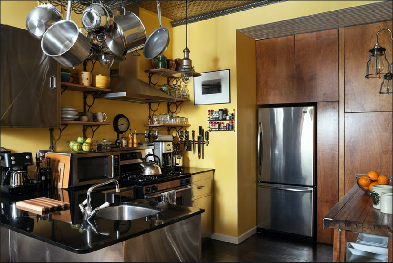Esta estética aporta calidez al mejor estilo industrial a todo color, añadiendo mayor intensidad en sus colores mediante de los nuevos textiles, la pintura de la pared y los adornos lograran también resaltar un nuevo ambiente. Su creadora e interiorista, Allison Aldrich, también propietaria de la vivienda neoyorquina del West Village, logra mantener el mejor estilo industrial a todo color, principalmente gracias a elementos arquitectónicos y la mejor elección de objetos industriales para la decoración. El comedor, con una mesa vintage de madera recuperada, es una de las piezas más singulares con un juego de sillas desparejadas y una lámpara de fábrica espectacular.