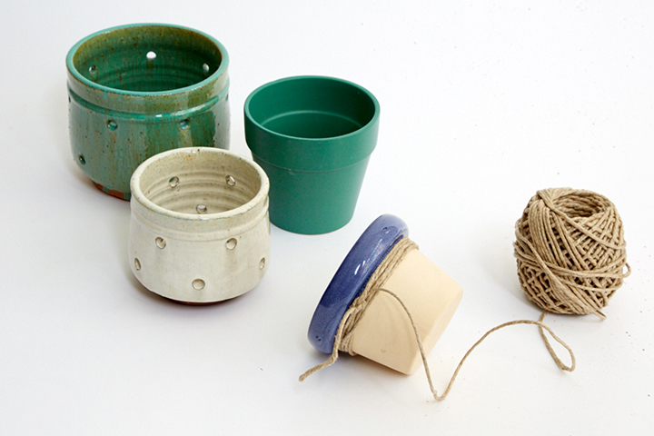 Luego han buscado unas macetas de diferentes formas todas ellas combinadas en colores marfil, azul y mint. Ten en cuenta que todas las macetas deben de tener un borde saliente para enrolar cuerda fina y poder colgarlas.
