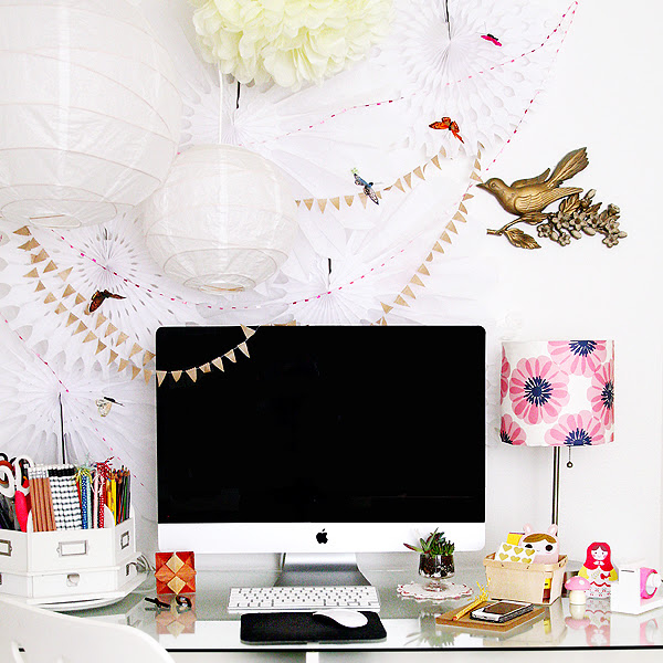 Rodeada de un ambiente de auténtico cuento, entre pompones, guirnaldas y mariposas, colores pastel combinados con otros mas estridentes y un conjunto de estampados florales y geométricos este despacho te lleva a un mundo paralelo lleno de encanto y personalidad.
