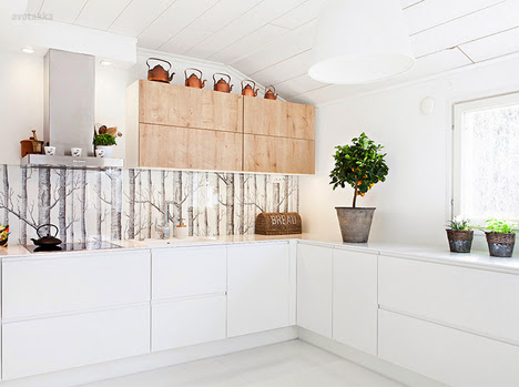 En este caso pertenecen a una misma casa. Me gusta mucho la estantería y algo que siempre me ha encantado, que es tener un cesto en el salón para guardar cojines. La cocina me parece preciosa y me ha sorprendido al tener el papel en la pared ya que sólo lo había visto en dormitorios y salones ;)