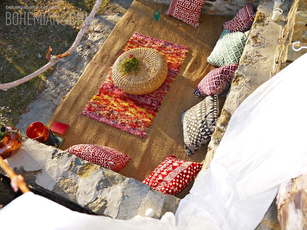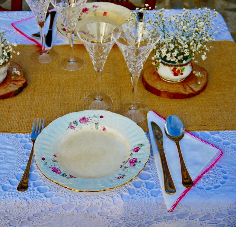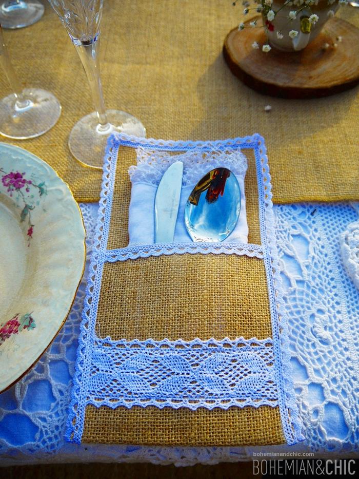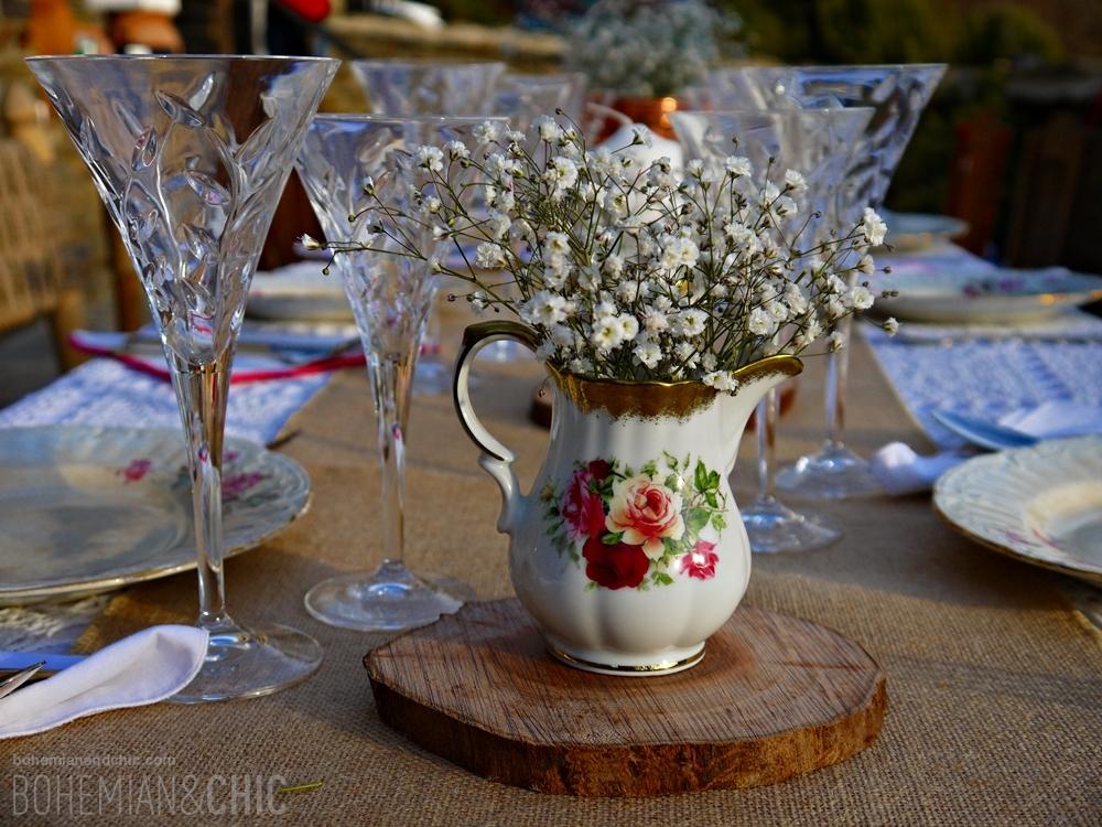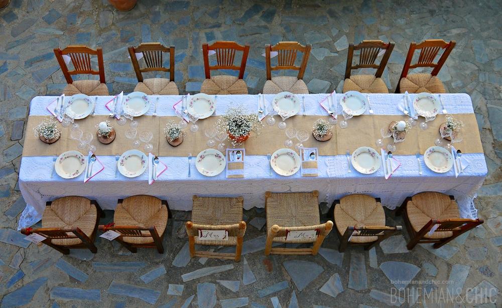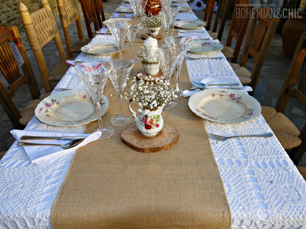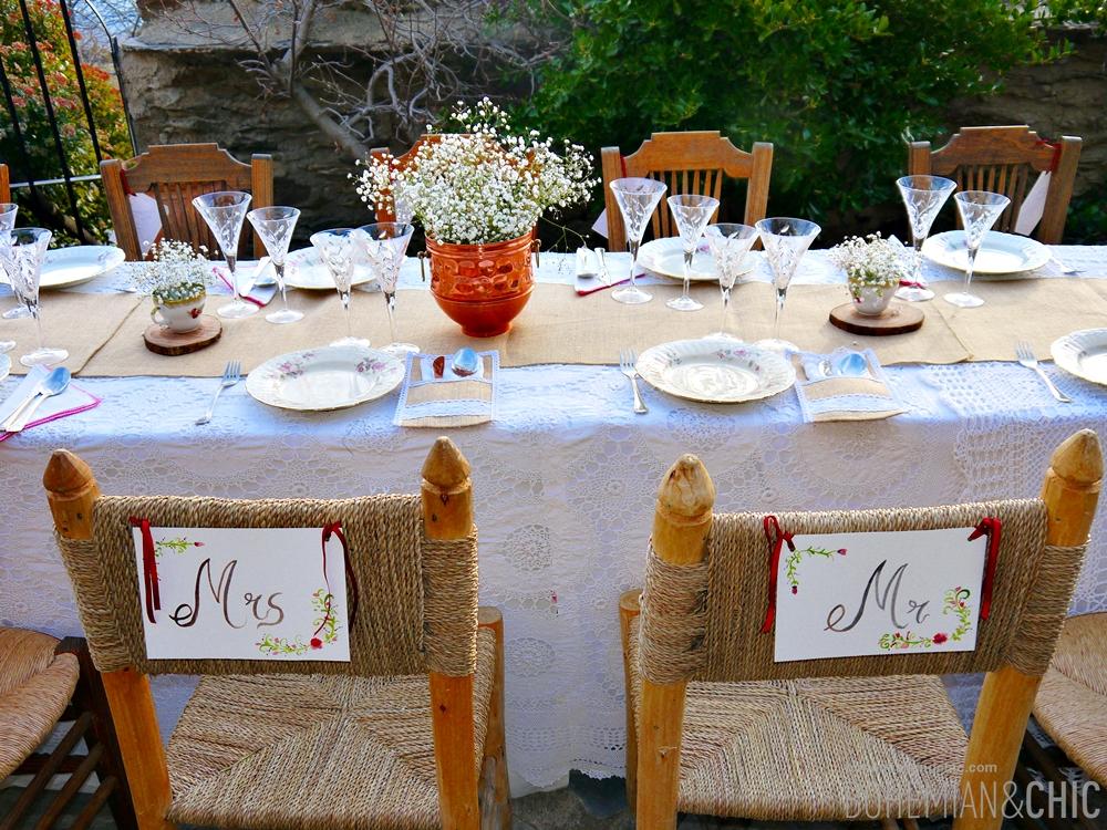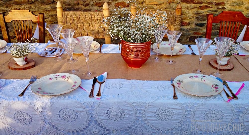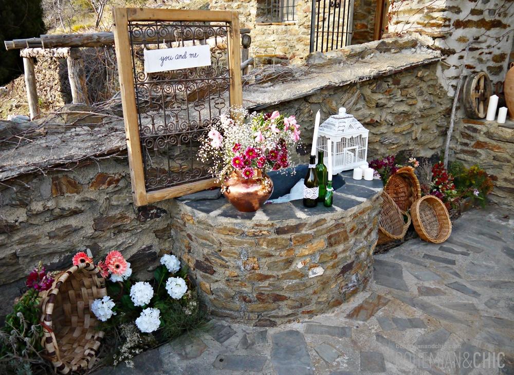 Jugamos con diferentes texturas,madera, crochet, arpillera, tejidos típicos de la Alpujarrade vivos colores .Detalles como porcelanas antiguas, cristal tallado y objetos de metal en cobre, cestos de mimbre artesanal de la zona jarapas y cojines de estilo étnico componen la decoración de esta sesión de fotos para creear una boda de estilo boho-chic. La flores no podían faltar tengo predilección por esta flor sencilla que es la paniculata que convertimos en protagonista de los arreglos florales combinada con otras en tono coral y burdeos y muchas, muchas cosas hechas a mano por nosotros como los indicadores de asiento hechos en acuarela o las rodajas de madera, los caminos de mesa y los portacubiertos de arpillera.