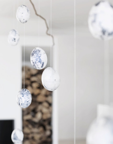 Ahora llega el momento de la decoración propia de Pascua. En el techo se ha instalado una rama de árbol y de ella se han colgado unos huevos de Pascua pintados con efecto marmolado.