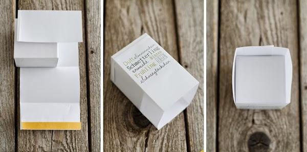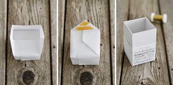 Utilizamos una caja pequeña como plantilla, no necesitas comprar una para la ocasión puede ser incluso de unos pendientes. Colocamos el papel alrededor y doblamos por la parte inferior envolviendo como si fuera un regalo.