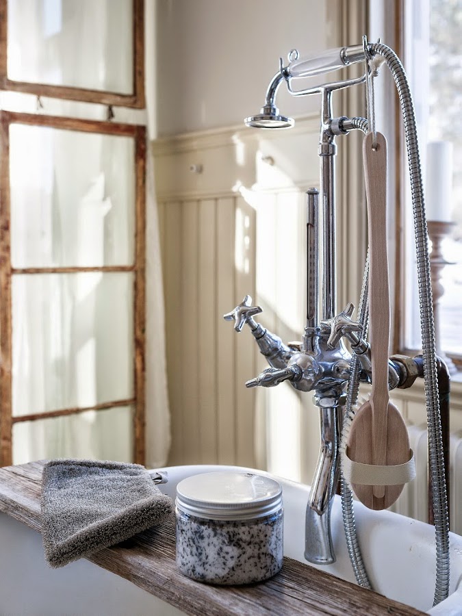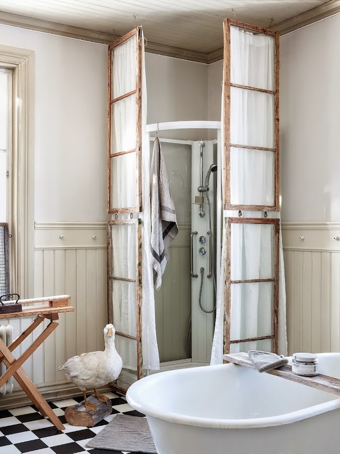 Además de la bañera de hierro, se incorporó un sistema de ducha que está enmarcado por unas ventanas antiguas que también fueron utilizadas para crear un armario donde guardar toallas y demás productos de baño.