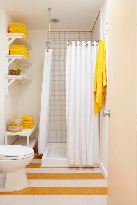 El juego de colores se mantiene en los dormitorios, espacios sencillos, luminosos y alegres gracias a las notas de color, y de nuevo, en las zonas húmedas, el juego de rayas en el suelo.