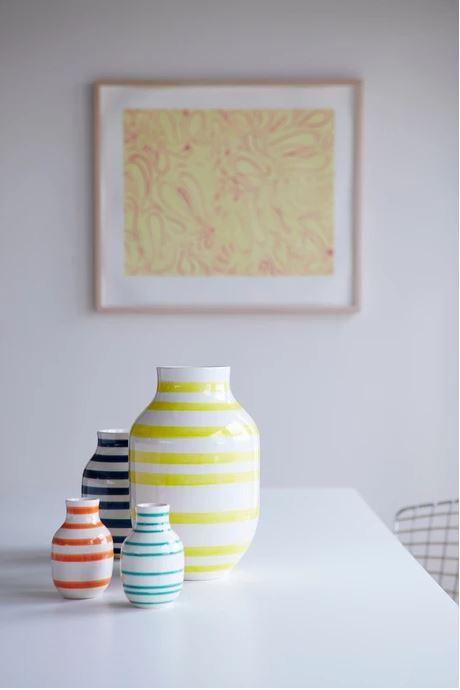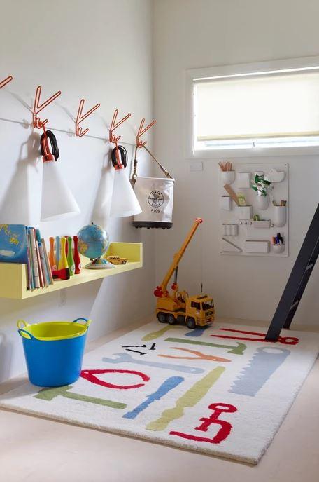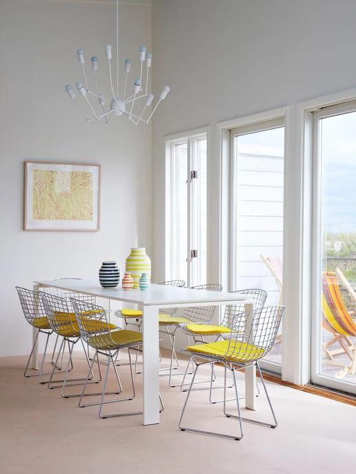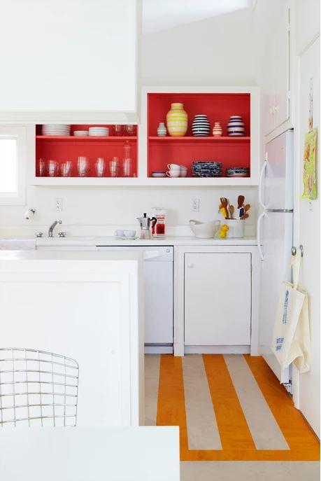 En la cocina, abierta, un tablero perforado y los estantes con el interior pintado en rojo aportan actualidad, y el suelo pintado en blanco y amarillo se convierte en punto focal, jugando con el color y las rayas de los complementos decorativos.