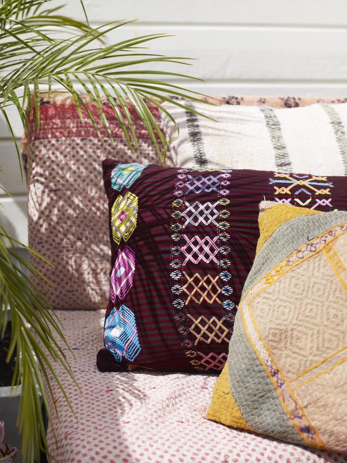 Se trata de un rincón de dimensiones reducidas pero decorado con un mobiliario y colorido perfectamente combinados. Sobre una alfombra se sitúa un banquito para terraza (que podéis comprar en Ikea, casualmente es el mismo que tenemos nosotros en la nuestra), una mesa con bandeja típicamente marroquí y numerosos textiles que la hacen, si cabe, todavía más bonita.