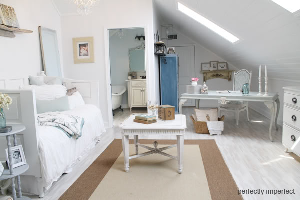 Una oscura buhardilla se transforma en un luminoso dormitorio. Tal como comenta María en Decor&me al cabo de poco se convirtió en un estudio, pero yo me quedo con esta imagen, la de un dormitorio muy femenino, decorado en tonos pasteles, con piezas vintage que lo llenan de personalidad.