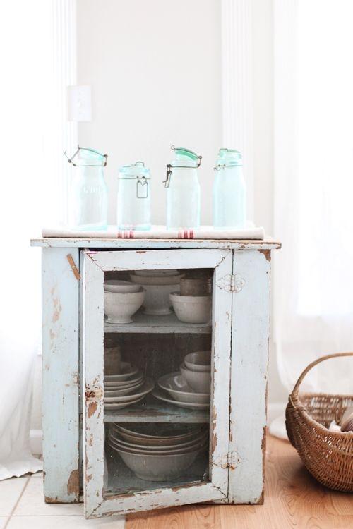 Un armario vintage que guarda la vajilla antigua de porcelana como tesoros de otras épocas. Siempre se puede pintar pero le quitaría todo el encanto y el sabor de un mueble artesano como ya no se fabrican. Tiene tanta personalidad que la he elegido como imagen de que lo viejo también puede ser bonito. Más inspiración nos la trae Sonia en Toc toc vintage.