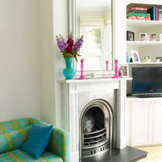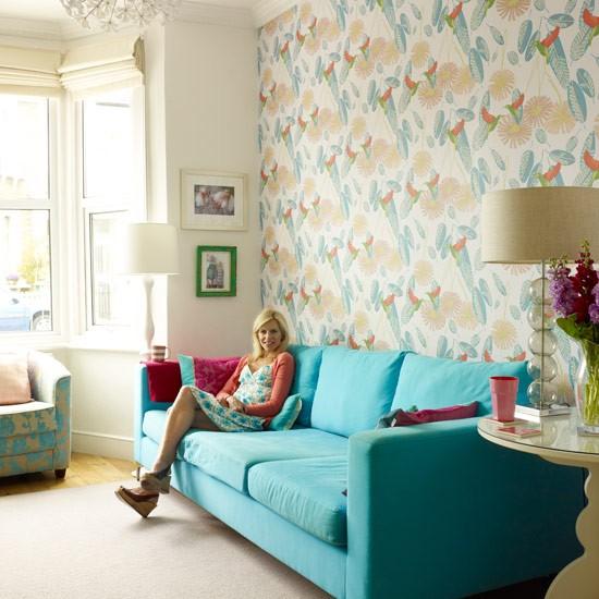 En el salón de Laura encontramos un sofá turquesa colocado junto a una pared que destaca
