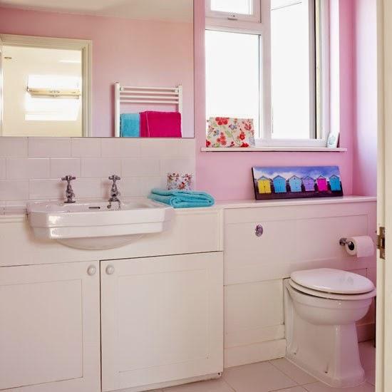 En el baño las paredes de color rosa pastel son el complemento ideal para los accesorios y