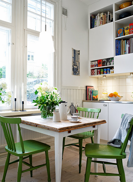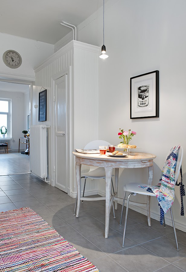 Aquí en España tenemos costumbre de tener un salón-comedor y luego en muchos casos un espacio en la cocina con otra mesa y sillas o similar para diario, desayunos o cenas rápidas... (yo tampoco puedo contar con ello) El tema es que a veces imaginarte ese espacio para decorar se reduce a mesas que vemos en todos los catálogos comerciales donde te ponen "OFERTA CONJUNTO MESA DE COCINA Y CUATRO SILLAS 99€" pues esto es como el frotar..."se va a acabar". Hoy quiero presentaros una serie de propuestas para esos espacios, algo distinto quizás mas cuidado de lo que nos presentan los catálogos coloquiales, muebles restaurados, toques de color y mezclas de estilos... BIENVENIDOS A LA ....