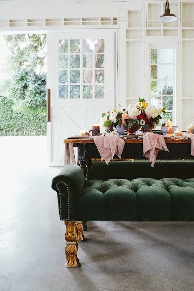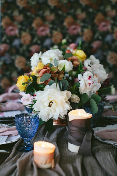 En la entrada este precioso tapiz de tela con impresión floral combina a la perfección los los muebles escogidos para la ocasión. El ambiente muy ecléctico: arreglos florales por todas partes y una mesa decorada con elementos de colores diversos y materiales naturales, me ha encantado ese camino de mesa de algodón, como han envuelto las velas con cinta de raso o las pulseras doradas que hacen la función de servilleteros.