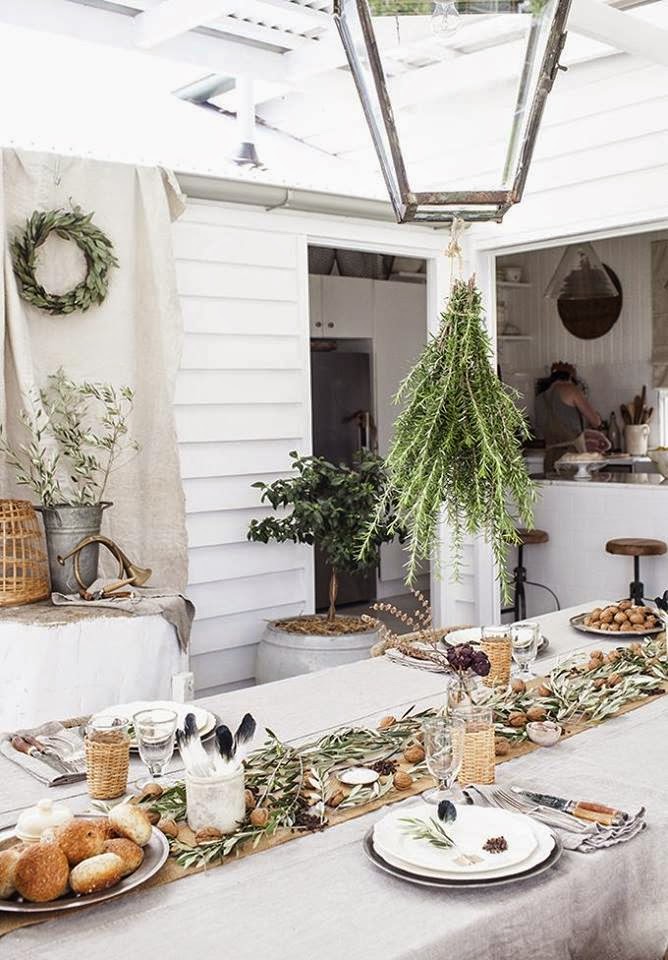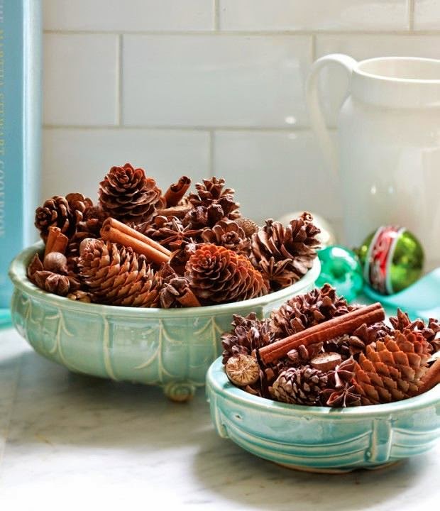 * Una manera económica para decorar tu mesa es usar materiales naturales que puedes encontrar en el jardín. Crea un centro de mesa atractivo colocando piñas y bayas estacionales en un bol grande de cristal, por ejemplo.