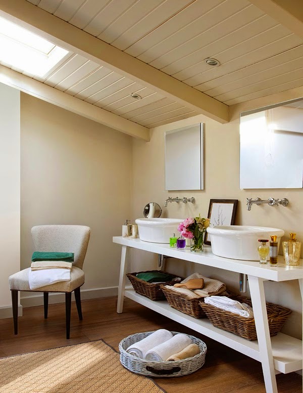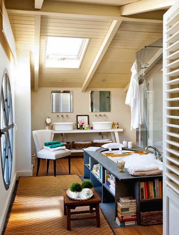 Con vistas a la sierra de Gredos, muy cerca de Ávila, este baño tiene aire bohemio con estilo de buhardilla parisina. Materiales como la madera, el sisal, los colores cálidos, ayudan al confort de una estancia para el descanso. La zona central de la bañera distribuye a los dos lados la zona de inodoro separado y creando intimidad mediante un biombo de persiana mallorquina, y la zona de lavabo al otro lado, en cada extremo. La ducha y la bañera quedan separadas pero comunicadas por una mampara de cristal que permite el paso de la luz. La aromaterapia juega un papel muy inportante en este baño, donde las velas ayudan a ganar bienestar con sus fragancias. El mueble bajolavabo es una original mesa de castaño pintada en blanco con un look campestre inglés.
