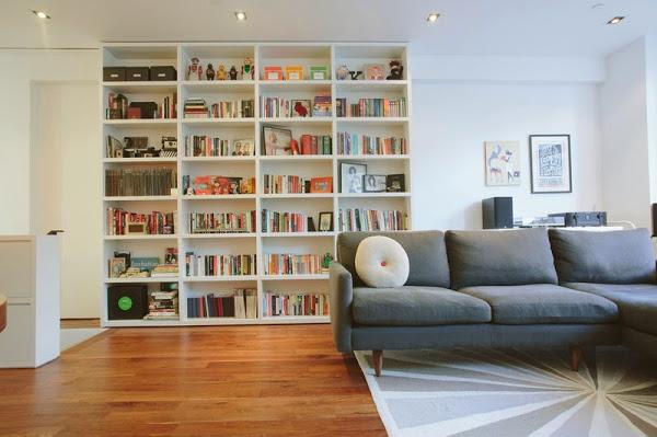 El propietario puede acceder a los libros y registros de una biblioteca de piso a techo sacando una escalera cercana. Cuando no está en uso, se desliza a toda la biblioteca fuera del camino sobre la escalera de la izquierda.