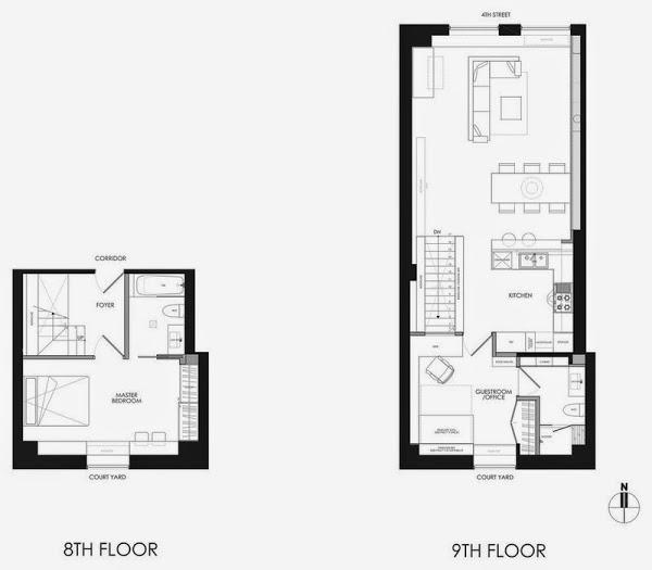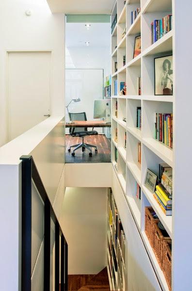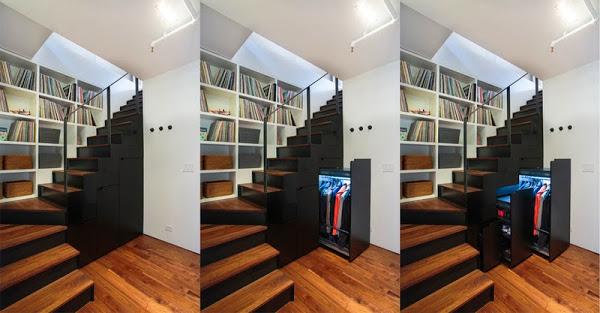 Un hall de entrada en el primer piso se accede al dormitorio principal y baño. Raad convirtio los espacio sobrante por debajo de la escalera en subida al almacenamiento de abrigo y zapatos con iluminación integrada LED Strip. Tres ganchos cercanos transforman la esquina en un cuartito.