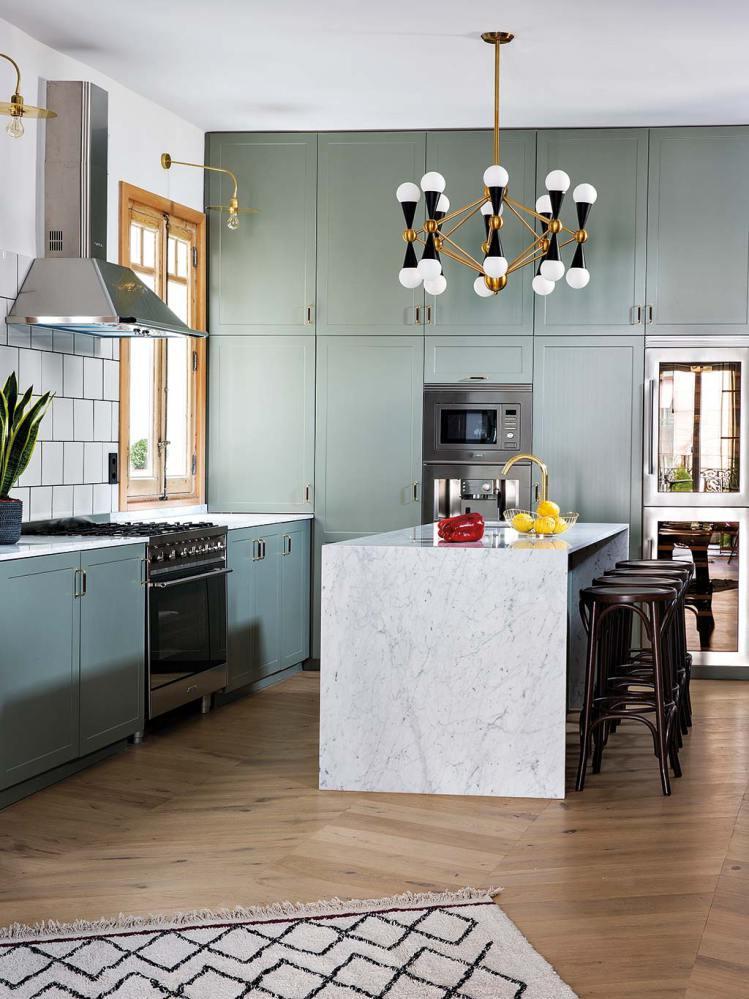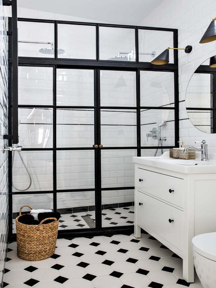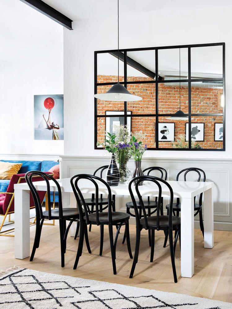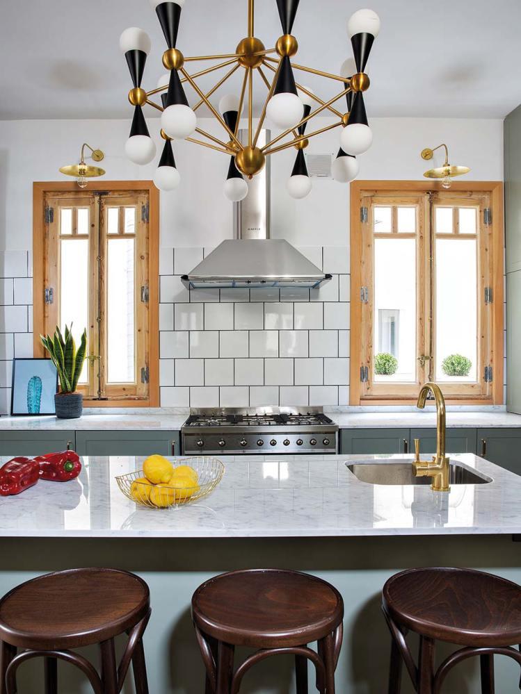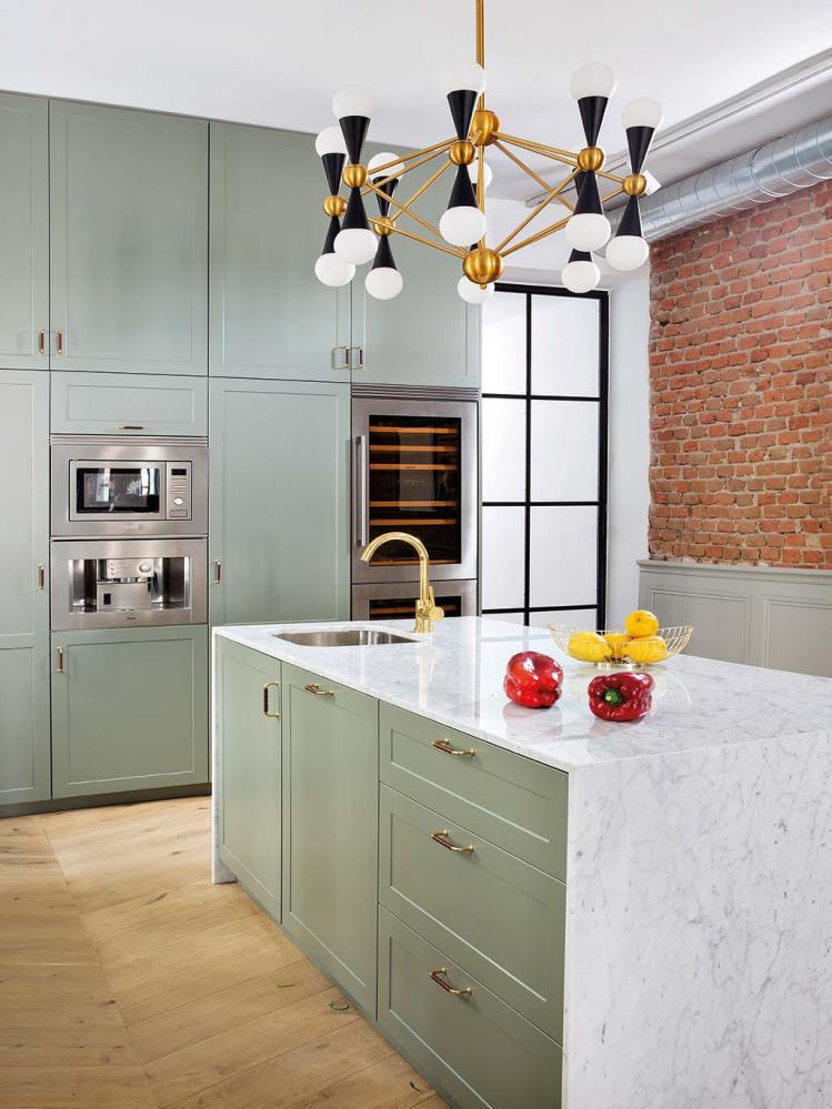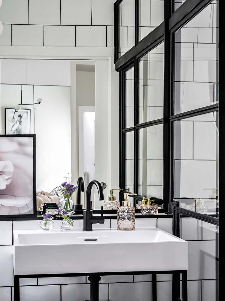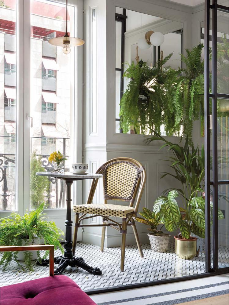 Los solados y revestimientos es una de sus principales bazas. La tarima de roble colocada en espiga acabada en barniz sin brillo, hacen del interior un espacio con personalidad y cálido. En la zona común, la tarima se enmarcó con terrazo a franjas blancas y negras hecho a mano, mientras que en sus paredes se recuperó el ladrillo original de la vivienda, que se encontraba oculto tras varias capas de enfoscado, y que se combinó con un friso de madera lacado en gris perla. Las carpinterías de ventanas se mantuvieron originales, con hojas de madera maciza y cerrojos verticales de hierro, y fueron restauradas para recuperar el esplendor de antaño. Para la zona de ‘invernadero’ se elige una mesa de bar con sobre de mármol y una silla de exterior. El objetivo era recrear la atmósfera de un café al aire libre, donde apetece leer un libro y tomar un buen té. La cocina cuenta con frentes en color verde grisáceo hasta el techo, y se completan con tiradores de latón forrados a mano con cuero, procedentes de Suecia.