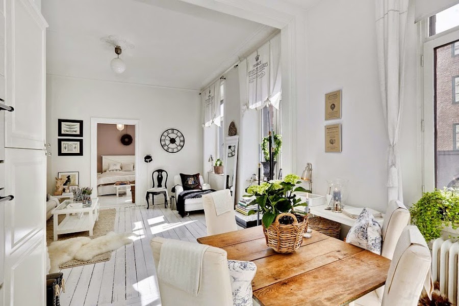 Los metros se aprovechan al máximo y se crea un ambiente romántico chic. En la cocina se utilizan piezas "reflectantes", en campanas, refrigerador y otros electrodomésticos, con lo que la luz del sol se refleja en ellos y se dispersa y hace que la habitación luzca más brillante y produzca amplitud visual. El toque shabby chic tan francés con ciertos acentos rústicos, le confieren al ambiente un toque acogedor y femenino.