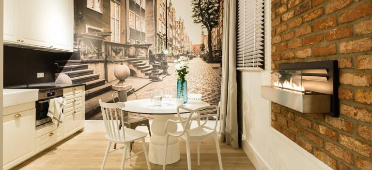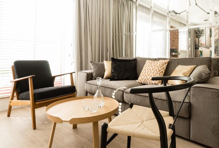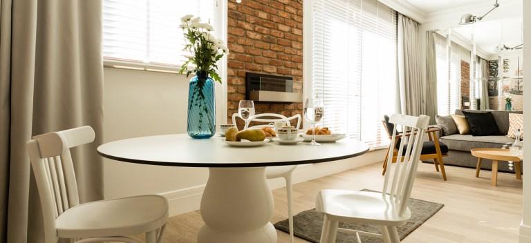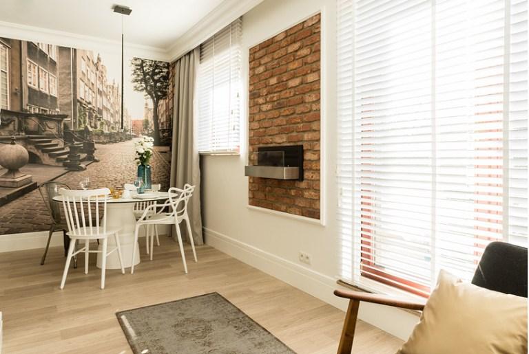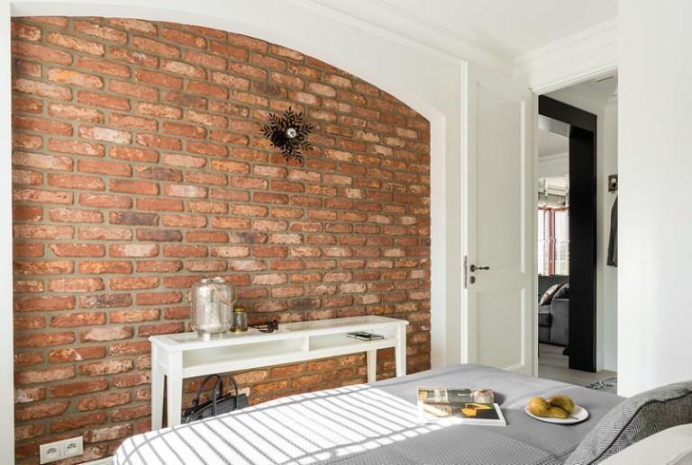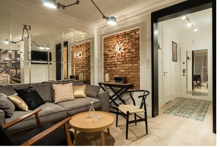 Un ambiente a modo de loft post-industrial, pero que no domina todo el espacio, y el resultado es acogedor y cálido. Una lámpara de brazos tipo Jieldé industrial en la sala de estar y lámparas colgantes en el dormitorio, son un elementos decorativos interesantes y distintivos. Los ladrillos rojos vistos en la sala de estar y el dormitorio tienen cualidades decorativas y, al mismo tiempo, le dan a este interior el color necesario. Una idea sensacional son los apliques discretos, colocados en la parte central de la pared de ladrillo. Cuando se enciende después del anochecer, la habitación tiene una atmósfera mágica e íntima. El interior de la sala de estar se ha agrandado visualmente con espejos colgados en la pared y ventanas grandes. Con lo cual se gana en luz y amplitud. En mi opinión, este es una reforma estupenda del apartamento, que no solo está bellamente presentado, sino que también es extremadamente funcional.