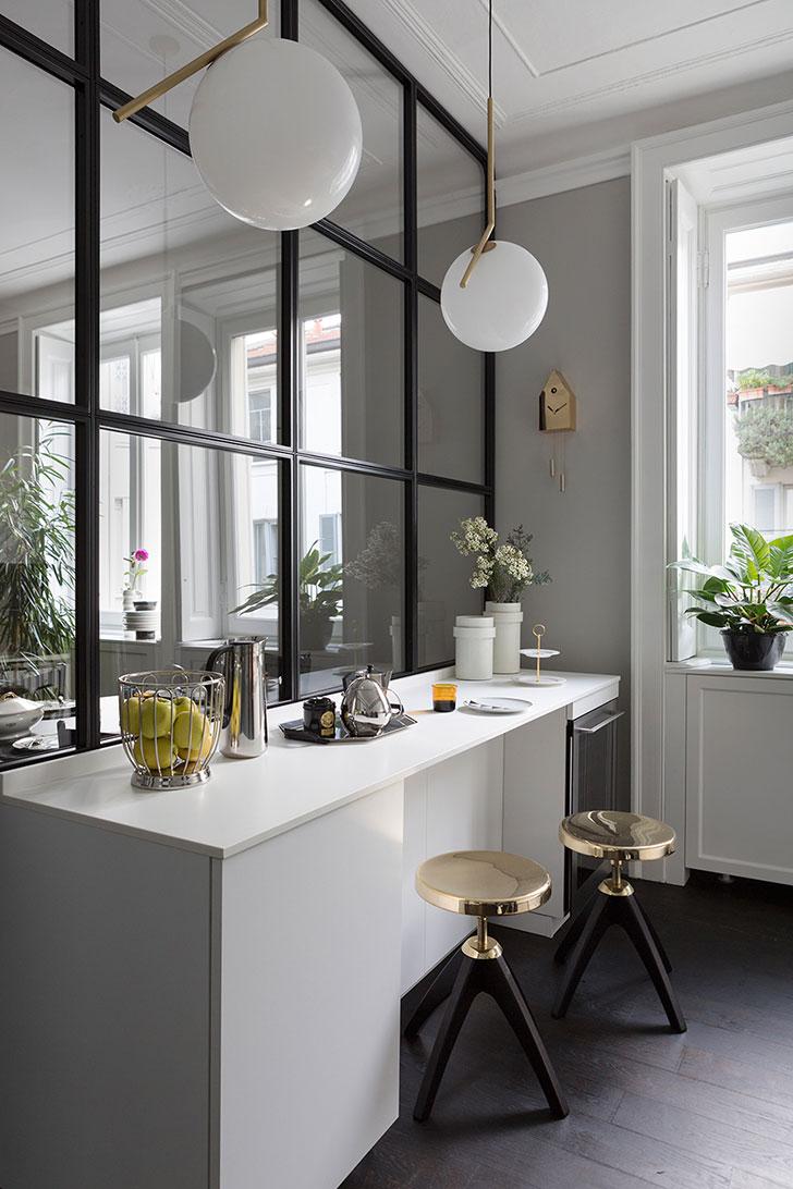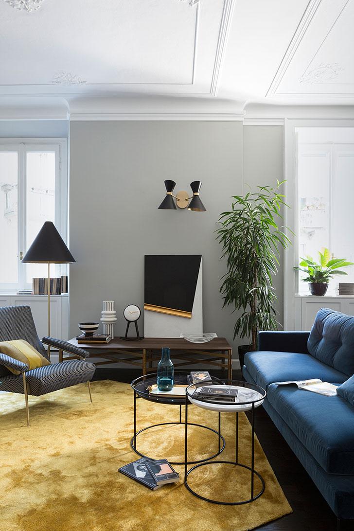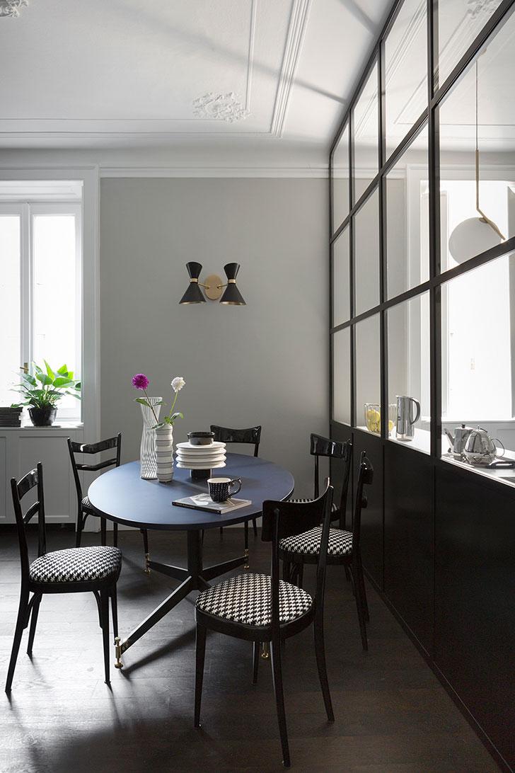 Mil detalles sutiles, femeninos y clásicos en contraste con piezas modernas y contemporáneas de los muebles, aportan personalidad a un interior ecléctico. La alfombra hexagonal, la pintura atípica y los objetos inusuales del salón crean una geometría especial, y junto con el color mostaza y el azul cobalto, se aporta elegancia distintiva a toda la decoración. En la zona de comedor y cocina la decoración en blanco y negro hace que el paisaje cromático cambie y vaya, desde los elegantes y vibrantes colores del salón, hasta los tonos monocromáticos en la cocina. La celosía metálica en negro y de cristal entre la sala de estar y la cocina, permite que la luz natural llegue a todas partes de la estancia, continuando la serie de líneas rectas en la decoración. Ventanas generosas, sin cortinas, dejan que la luz lo inunde todo. Destacan los muebles oscuros y ayuda a que se vea más espacioso.