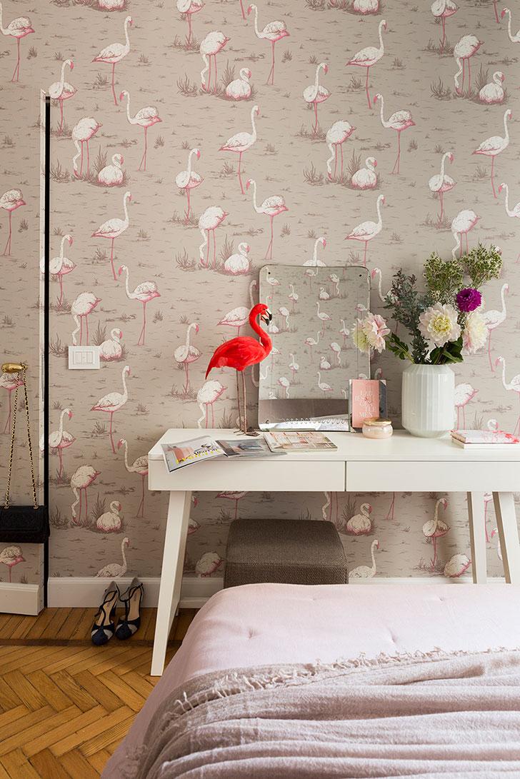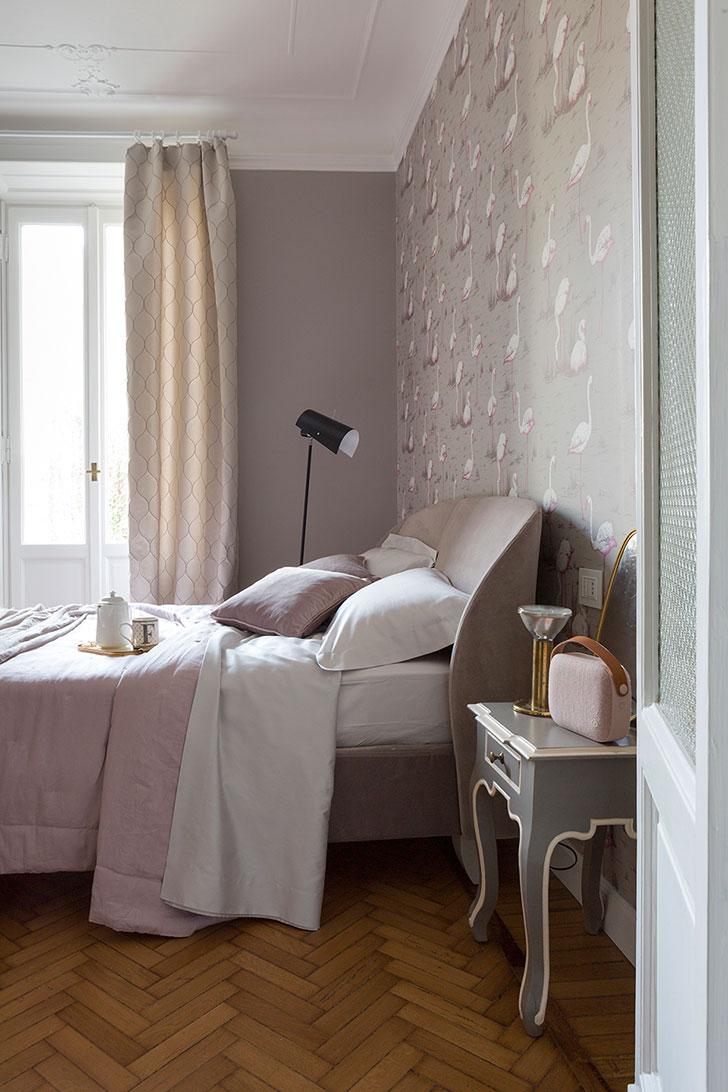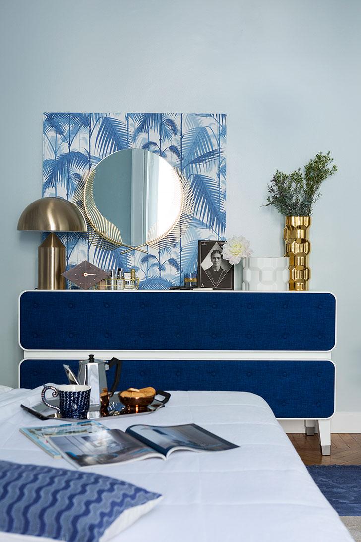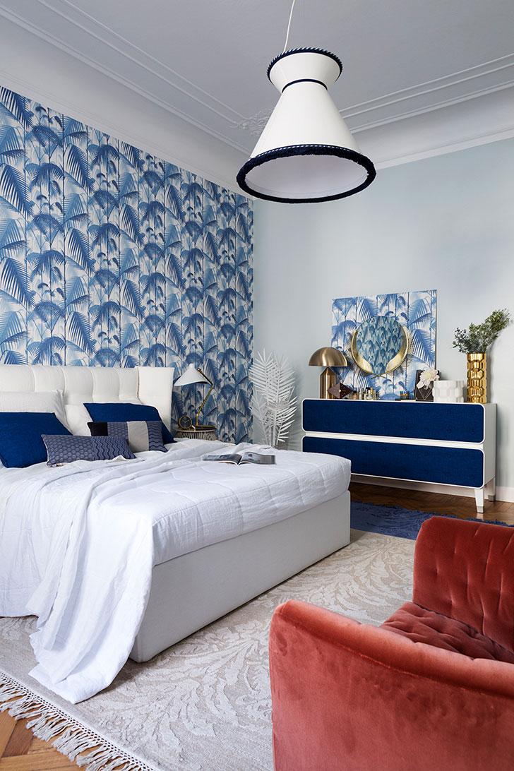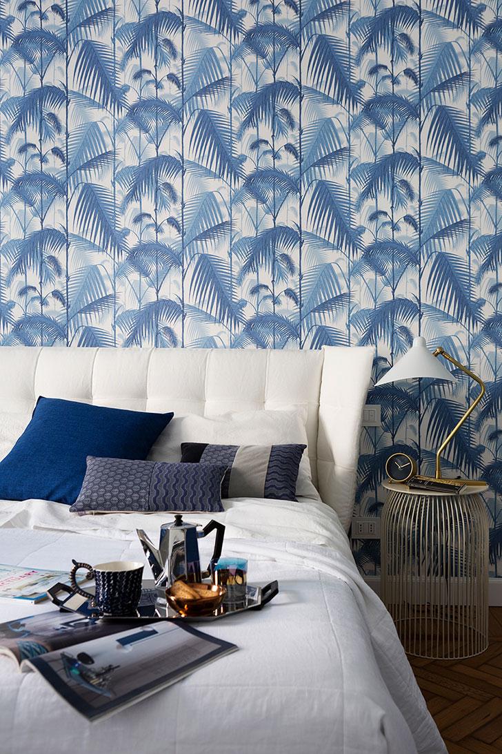 El dormitorio de invitados tiene acentos exóticos, impuestos por el papel tapiz de hoja de palma de Cole & Son, que combina los tonos azules de la sala de estar con el blanco de la cocina. Los tonos utilizados crean un ambiente cálido y tranquilo que, junto con el suelo de madera maciza, hacen que los huéspedes se sientan como en casa. La decoración se complementa con el sillón rojo, que agrega un plus cromático a la disposición. El color fuerte de la butaca aporta dinamismo y levanta la monotonía.