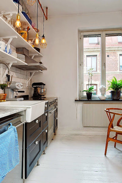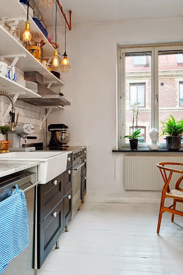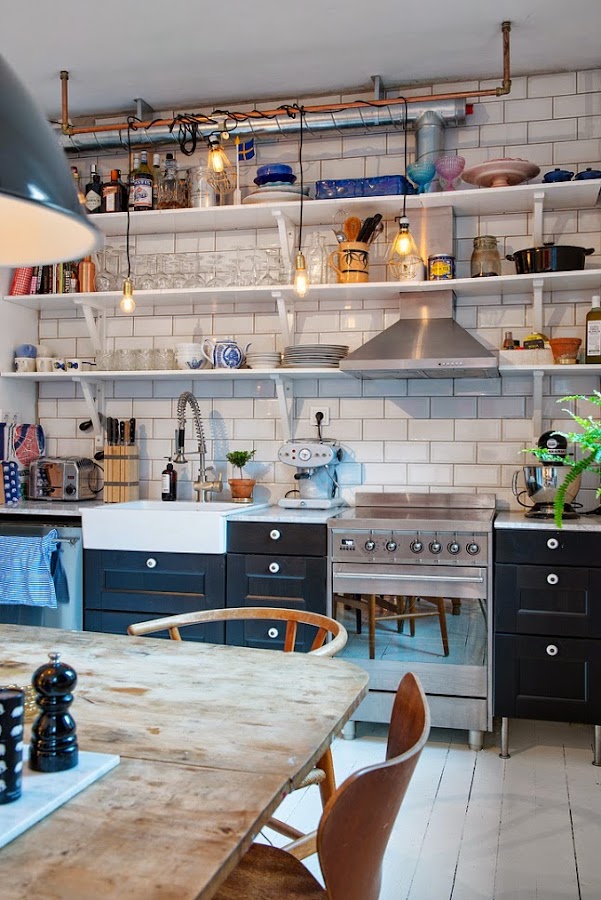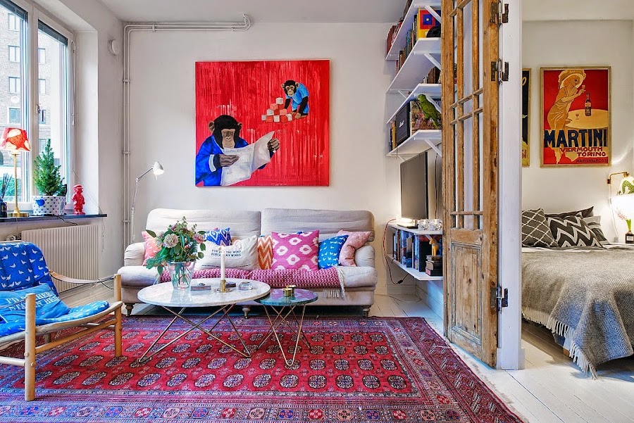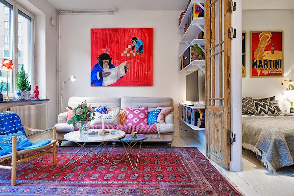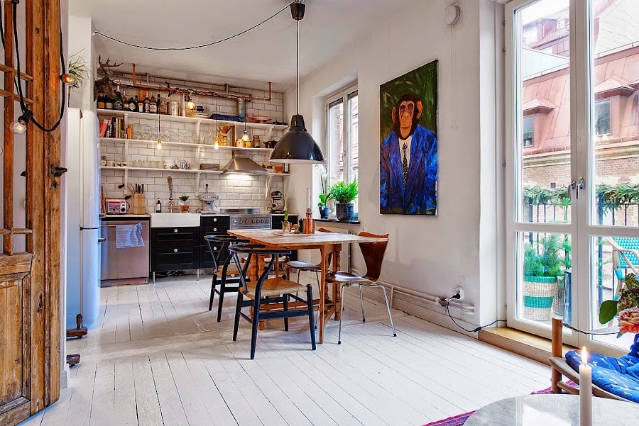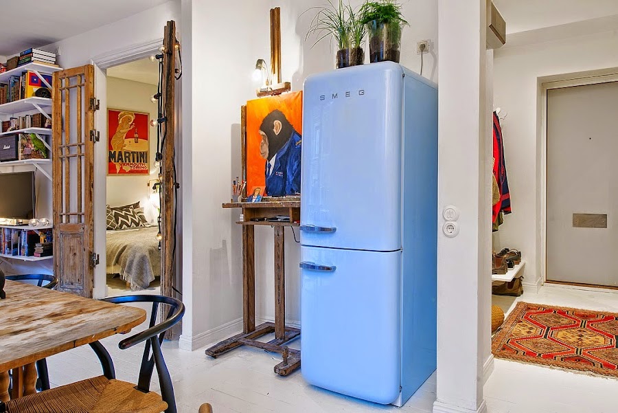 Es un interior con mucha personalidad donde destacan los acentos en piezas vintage como las puertas de acceso al dormitorio recicladas, el juego de sillas diferentes del comedor, la nevera Smeg en azul, la alfombra que crea un cuadrante de calidez en la zona de sofá y los cuadros súper coloristas de chimpancés repartidos por toda la casa. La cocina es el alma, muy ecléctica y llena de "vivencia" con una espectacular zona de estanterías abiertas con "todo a la vista" que me encanta y con un cerámico en la pared de estilo "subway tiles". Al estar todo abierto sin apenas tabiquería, se crea un circulación perfecta donde predomina el buen uso de los espacios, la iluminación y los toques a todo color.