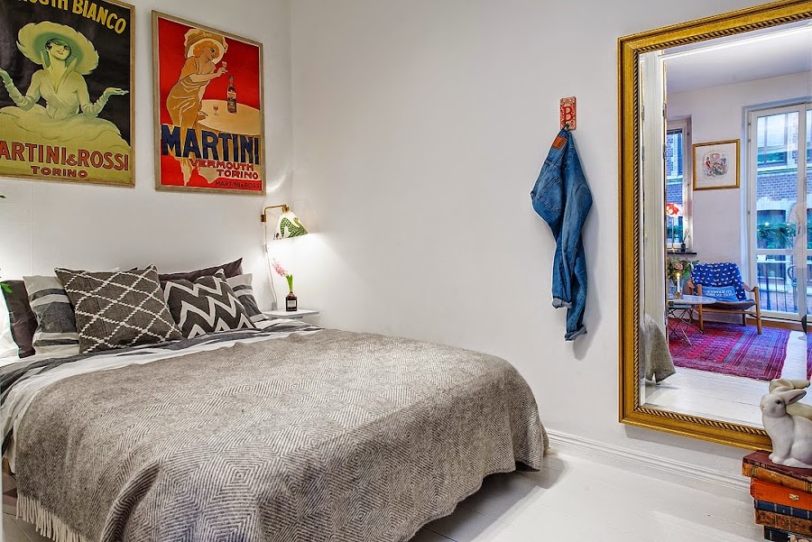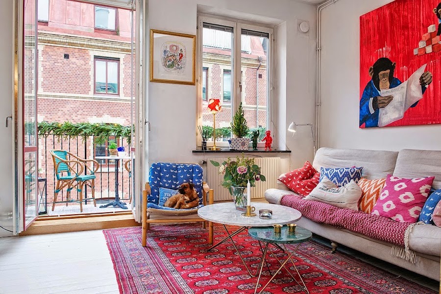 El espacio interior de hoy es la clara respuesta a un mini espacio al que se le ha sacado el máximo partido sin escatimar en eclecticismo y color. A veces en decoración es necesario arriesgar y, a pesar de no contar con muchos metros cuadrados en este apartamento, la apertura de cada estancia, quedando comunicadas entre sí, y una paleta de base neutra aprovechando los techos y el solado, permiten el uso del vibrante color y de las piezas con personalidad sin que agobie ni empequeñezca el espacio. La cocina se encuentra completamente abierta a la zona de comedor y salón y resulta en centro neurálgico de la vivienda.